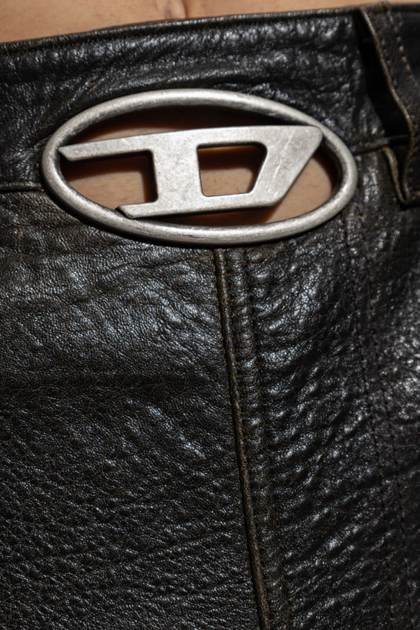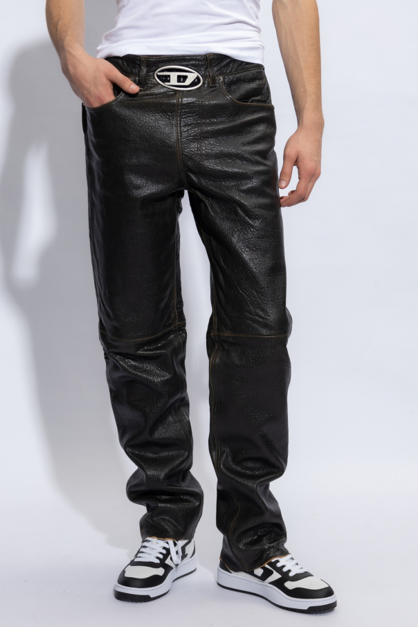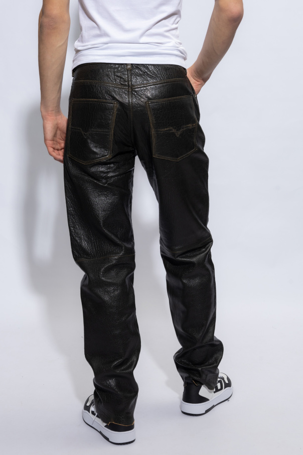 Dark brown ‘P-KOOMAN’ trousers from Diesel. Made of aged sheep leather, this pair is embellished with a silver-tone metal logo emblem on the front and features a side zip fastening, five slip pockets, frayed cuffs and a logo patch on the front.
