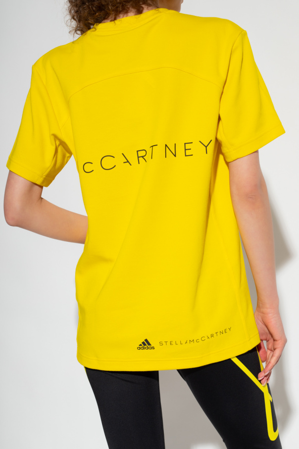 Yellow loose-fitting T-shirt from ADIDAS by Stella McCartney. Crafted from a blend of organic cotton and recycled fabric, this short sleeve design features a black logo print and ribbed crew neck.