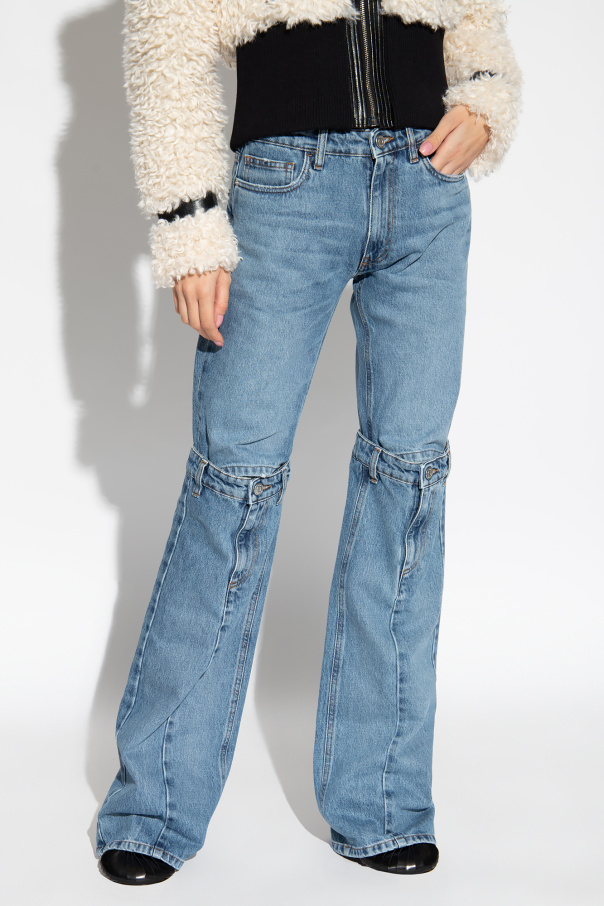 Blue jeans from Coperni. Fastened with a button and zip, this pair features a white logo patch at the back, five slip pockets, and flared legs with buttoned and zipped cut-outs at the knees.