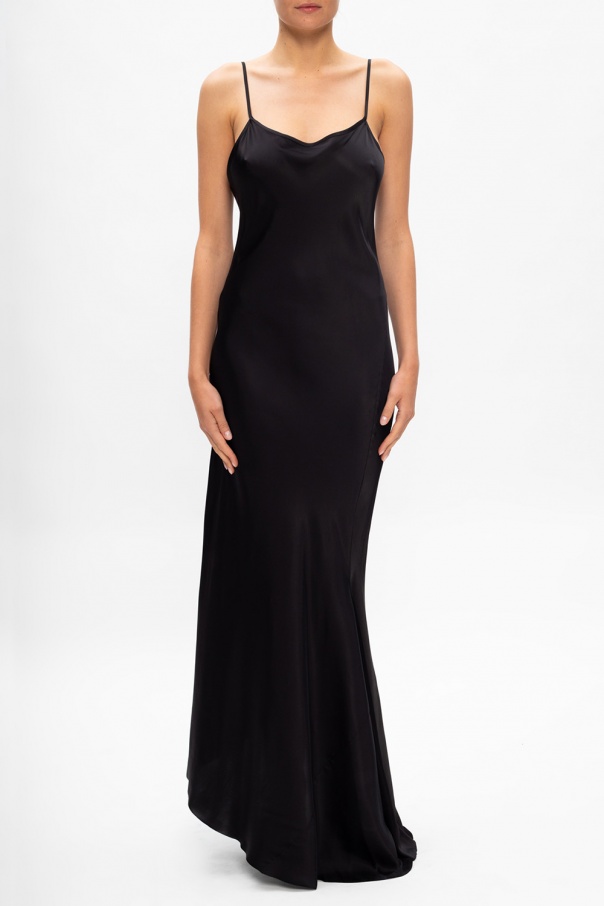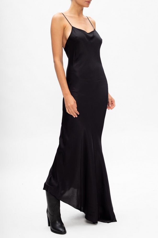 Black slip dress from Ann Demeulemeester. Featuring an asymmetric silhouette, this sleeveless design is finished with a raw edge hemline.