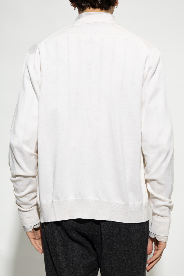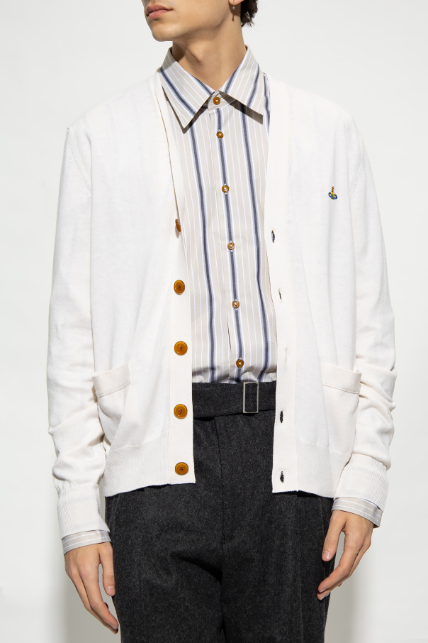 Cream cardigan from Vivienne Westwood. Made of a cotton and cashmere blend, this style showcases an embroidered logo pattern, button fastenings, two slip pockets, long sleeves and ribbed trims on the V-neckline, bottom hem and cuffs.