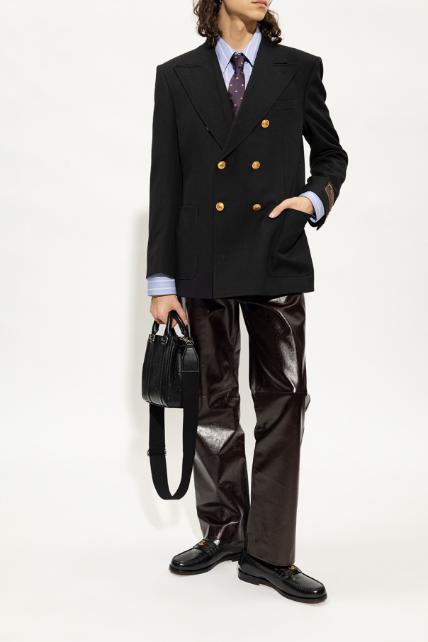 Black loafers from Gucci. Crafted from leather, this model sits on a brown leather sole and showcases a green and red Web stripe and gold-tone logo hardware on the front.