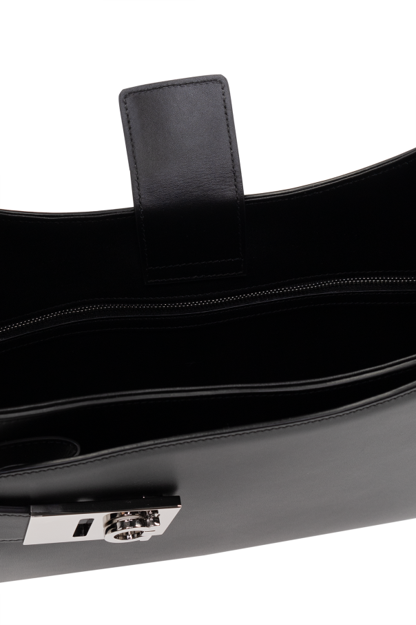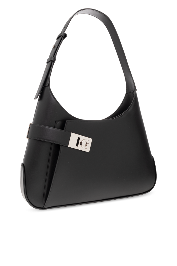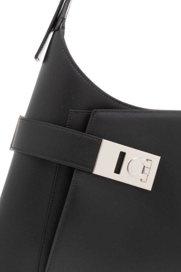 Black ‘Arch’ shoulder bag from FERRAGAMO. Made from smooth calf leather, this design secures with a magnetic fastener and showcases a decorative strap with ‘Gancini’ hardware and one pocket on the front. It is complete with an adjustable shoulder strap, silver-tone metal elements and one internal compartment with one zip pocket and two slip pockets.