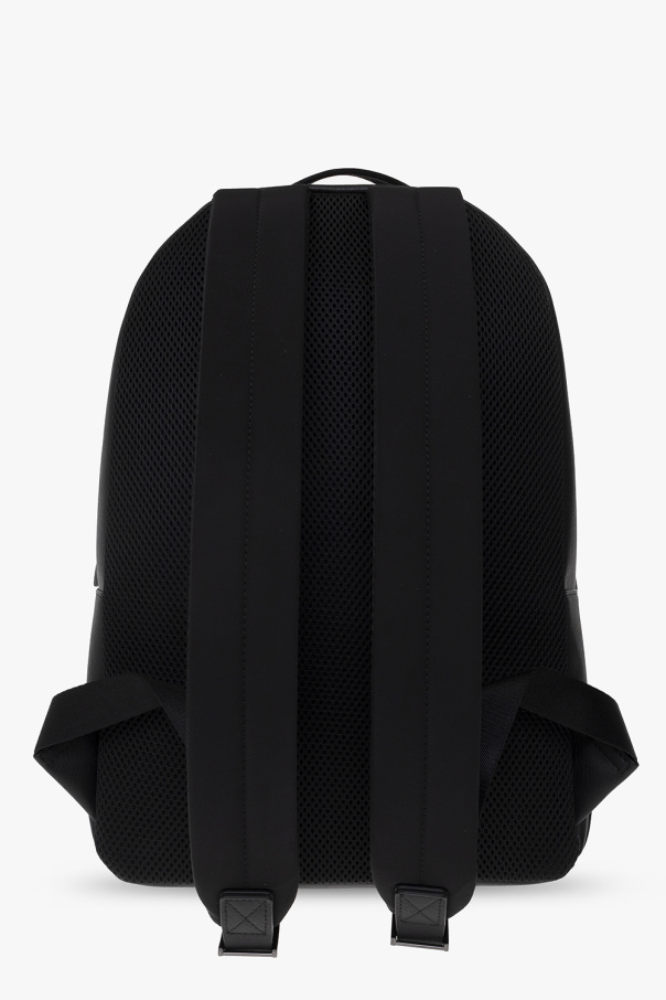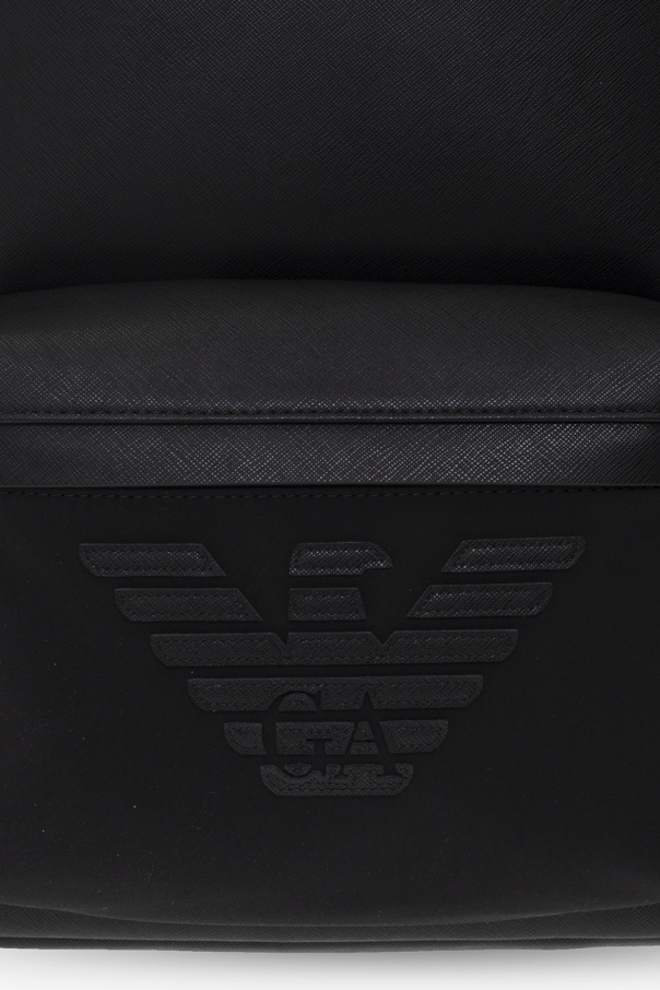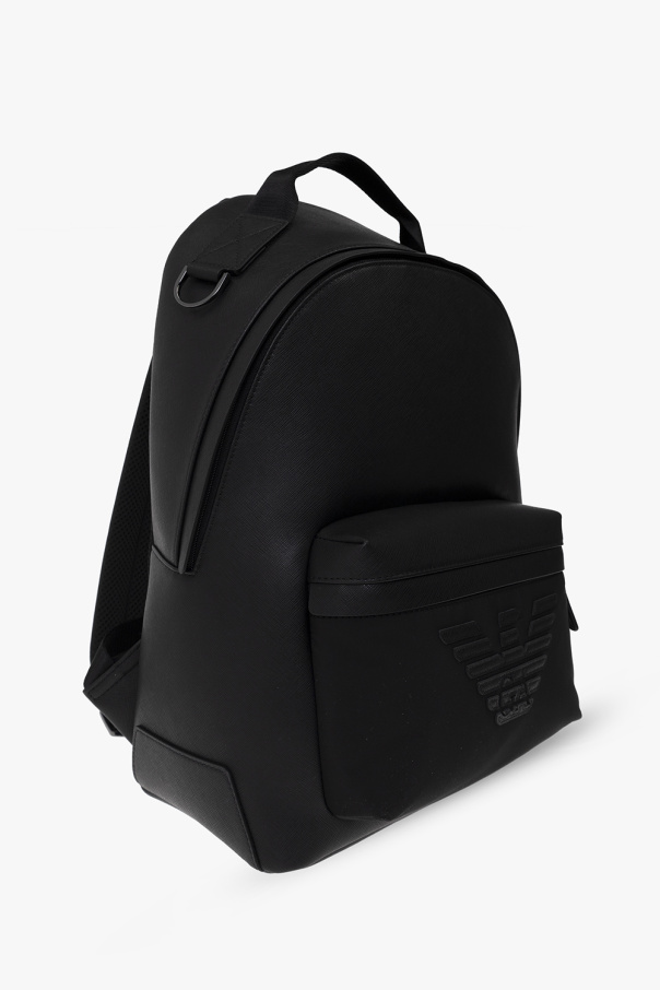 Black backpack from Emporio Armani, the ‘Sustainable’ collection. Crafted from faux leather, this design fastens with a two-way zipper and features a logo patch accompanied by a zip pocket on the front, a half-round handle, adjustable shoulder straps, black metal hardware and one internal compartment with three slip pockets.
