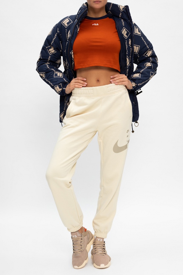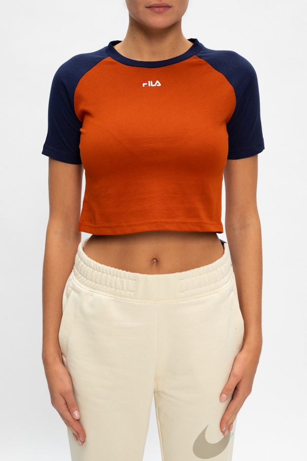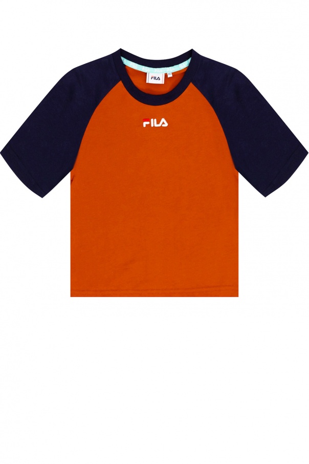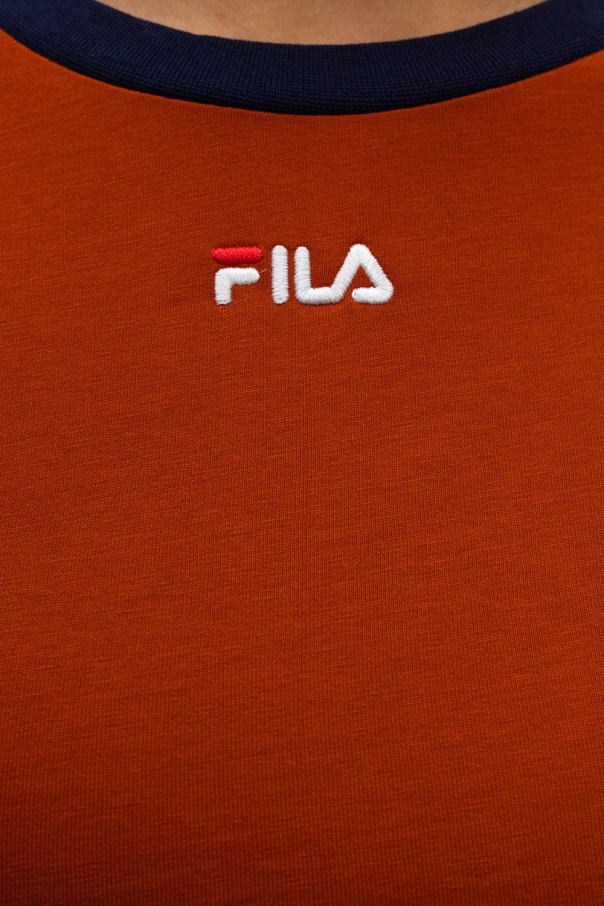 Brown and navy crewneck T-shirt from Fila. This design comes decorated with a logo embroidery in white and red.