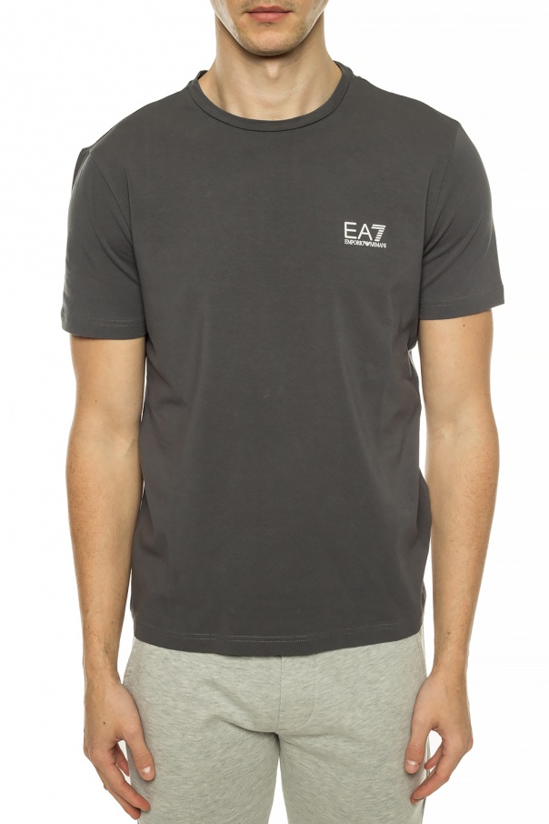 Dark grey T-shirt from EA7 Emporio Armani. Made of cotton. Front decorated with a white logo print. Round neck. Short sleeves.