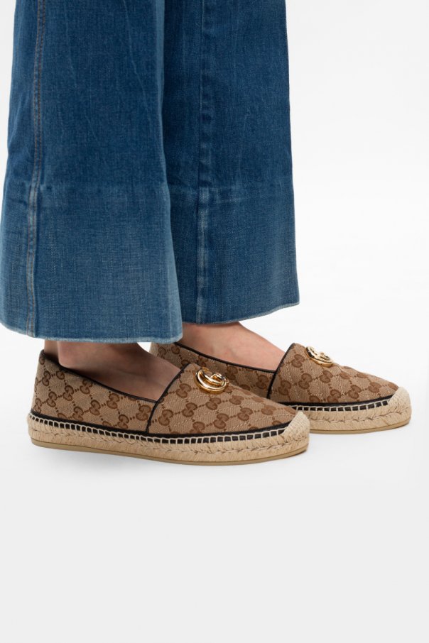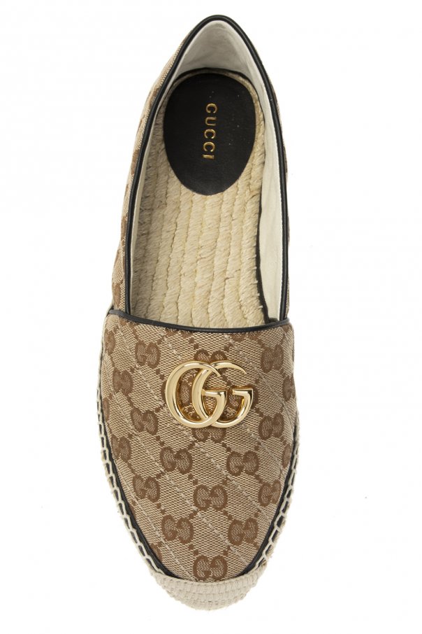 Beige, brown and black espadrilles from Gucci. Made of ‘GG Supreme’ canvas. Decorated with an embroidered logo pattern and a metal logo in gold-tone. Beige rubber sole.