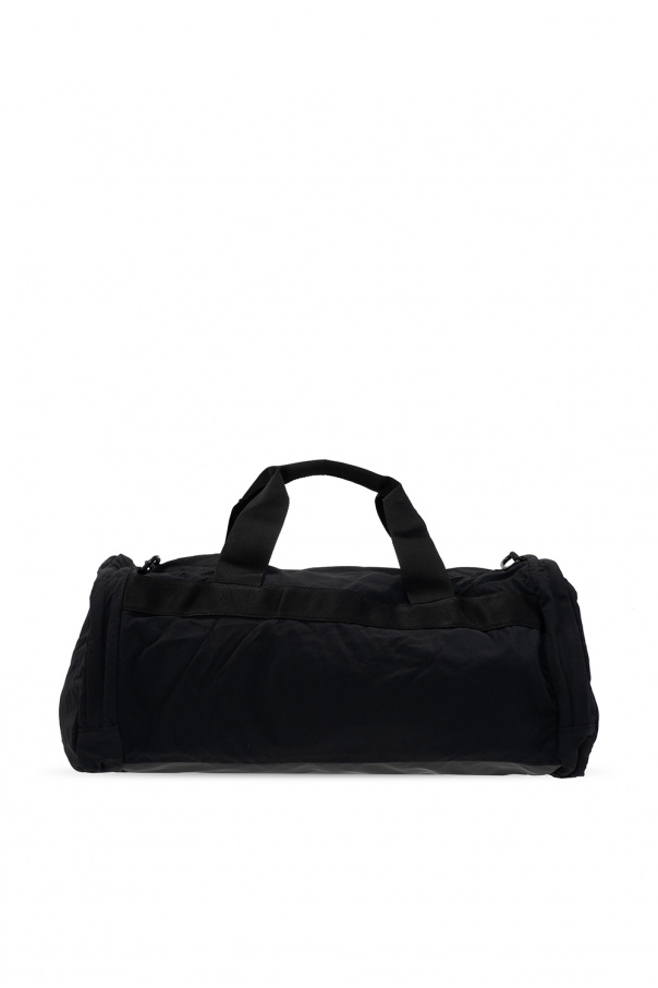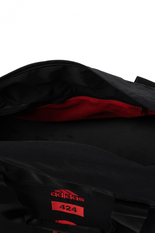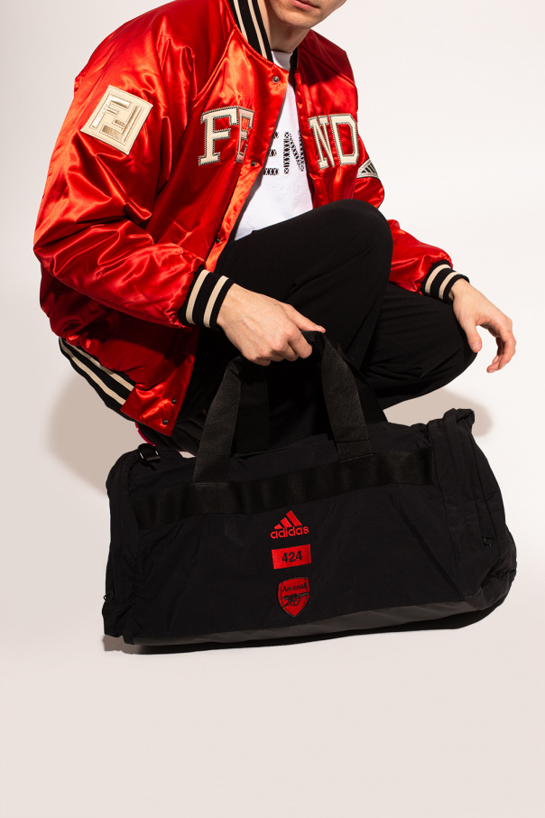 Black holdall bag from ADIDAS Performance x Arsenal F.C. X 424. Fastened with a zip, this item features a red logo embroidery, two zip pockets on the sides, two half-round handles, detachable and adjustable shoulder strap and one internal compartment with one zipped mesh pocket. ADIDAS and 424 have teamed up for a capsule collection representing the colors of the London-based Arsenal Football Club that is also a nod to the architecture of its Emirates Stadium home. The collection is showcased in a lookbook featuring current Arsenal stars Alexandre Lacazette, Willian and Gabriel.