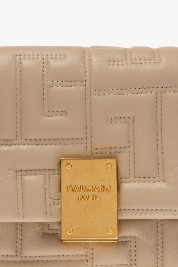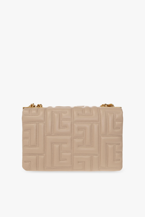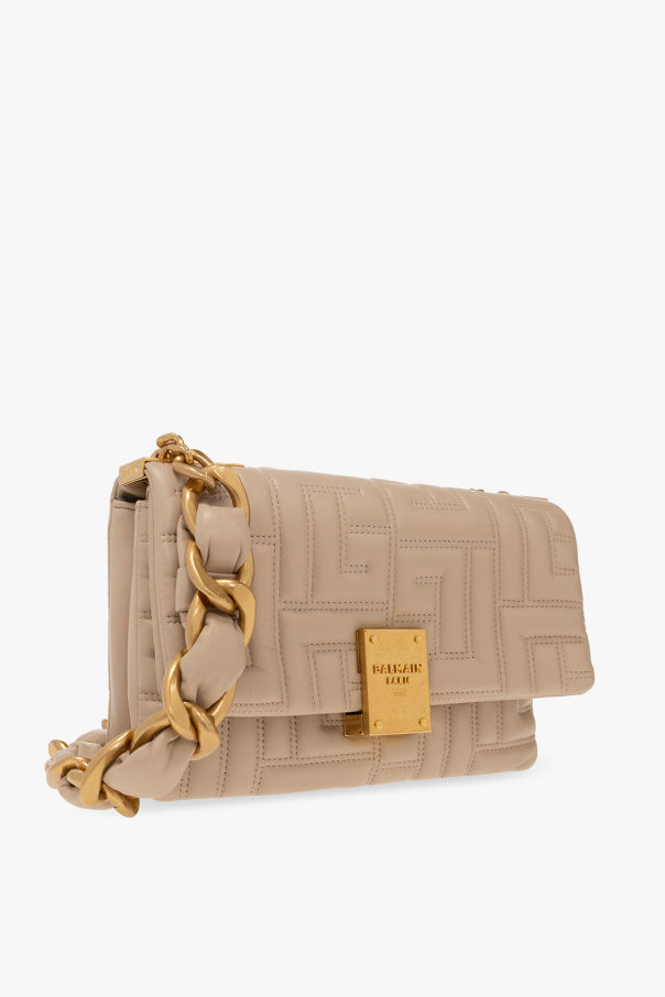 Beige ‘1945 Small’ shoulder bag from Balmain. Made of lamb leather with a quilted monogram pattern, this design features a metal snap button with a raised logo, chain woven with leather, antique gold-tone metal hardware and two internal compartments with a flap pocket and a card slot.