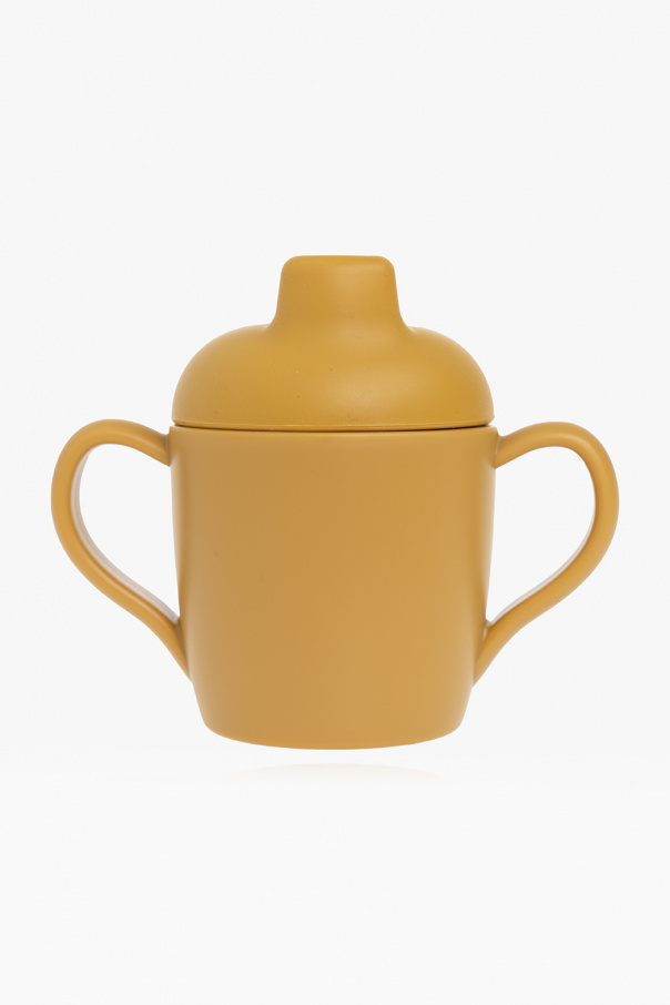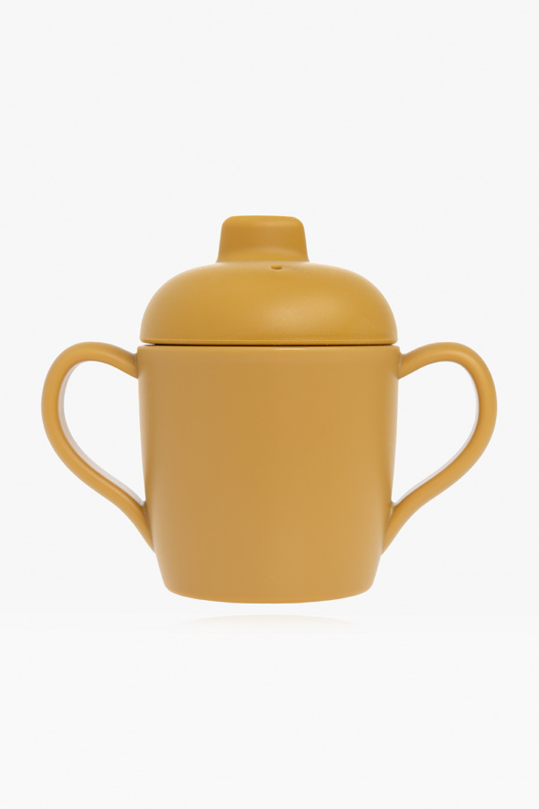 Set of two sippy cups in cream and beige from Konges Slojd. Made from silicone, both items feature two practical handles and a removable lid with a small spout. One cup has a colourful print with lemons. Good for practicing first sips.