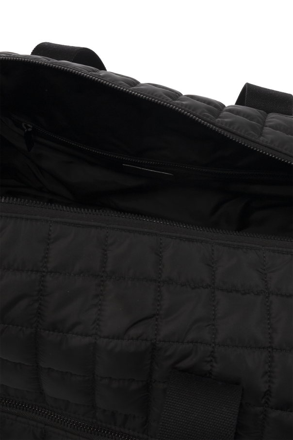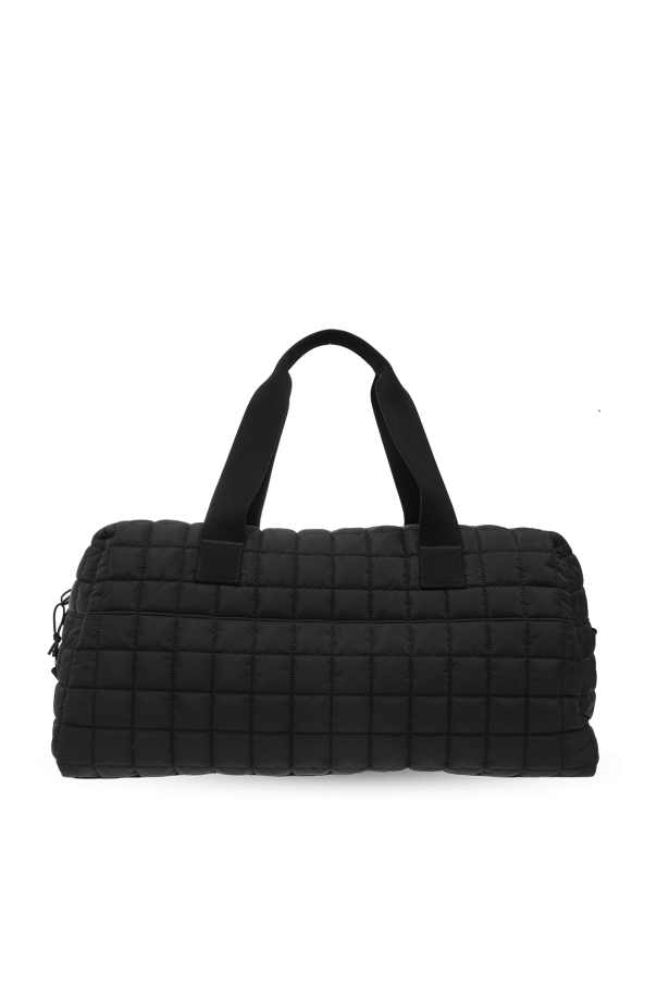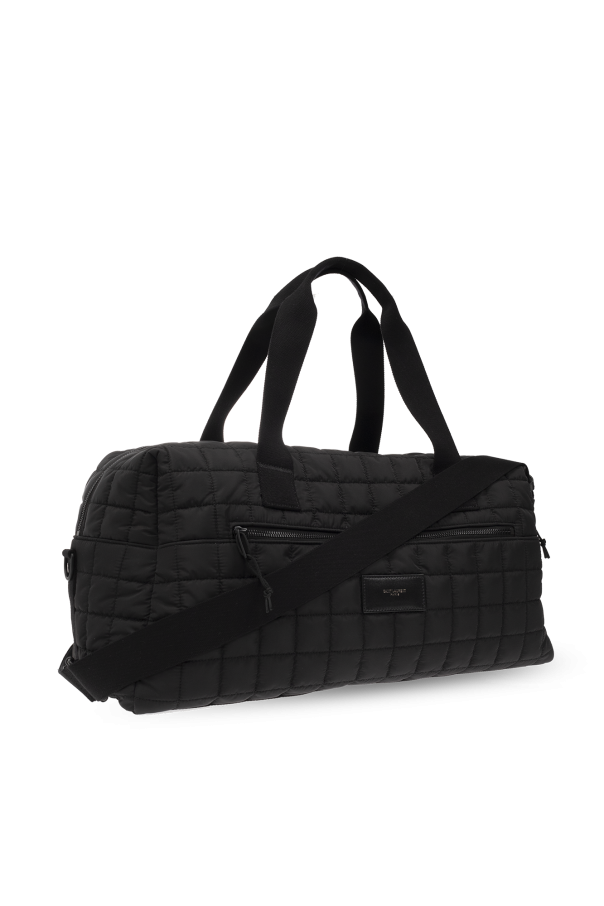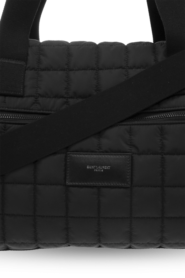Black ‘Nuxx’ quilted duffel bag from Saint Laurent. Made of recycled material, this design secures with a two-way zip and features a logo patch, one zip pocket on the front, two half-round handles, a detachable and adjustable shoulder strap, black metal hardware and one internal compartment with a zip pocket.