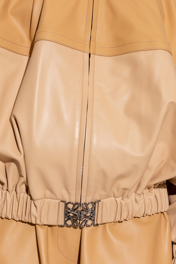 Beige bomber jacket from Loewe. Made of leather, this style features a zip fastening, a decorative logo-shaped buckle, two slip pockets and an elasticated bottom hem and cuffs.