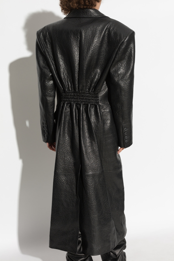 Introducing the epitome of luxury and sophistication – the Loggs Leather Coat from the distinguished collection by The Mannei. Expertly crafted for the discerning woman, this coat is a harmonious blend of classic design and contemporary elegance. This long coat, extending below the knees, showcases wide, prominent shoulders and straight, long sleeves, providing a structured and commanding silhouette. The black leather used is of the highest quality, featuring a distinctive embossed texture that exudes opulence and refinement. Designed with meticulous attention to detail, the coat boasts a classic lapel collar, a two-button closure, and three pockets – two front flap pockets and one chest pocket. The back of the coat is adorned with a gathered detail that accentuates the waist, adding a touch of femininity and grace. Additional button details on the cuffs further enhance its sophisticated appeal. Why Choose This Product? Exclusive Design: Part of a prestigious collection worn by celebrities like Elsa Hosk and Hailey Bieber. Premium Material: Crafted from high-quality black leather with an embossed pattern. Elegant Details: Features a classic lapel collar, gathered waist, and button accents. Tailored Fit: Structured shoulders and long sleeves for a commanding presence. Authentic Craftsmanship: Created in Polish ateliers, ensuring the highest quality and authenticity.