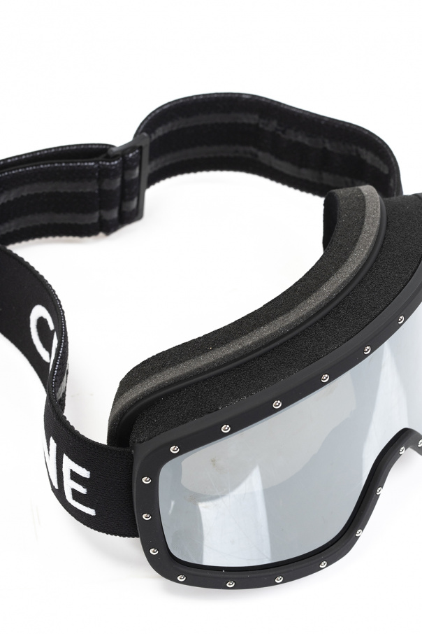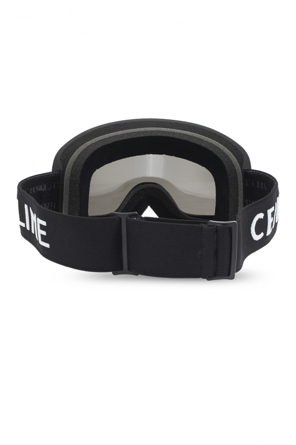 Black ski goggles from Celine. Enriched by distinctive silver-tone metal hardware on the front, this pair features an adjustable band with an embroidered white logo. These goggles ensure visual efficiency and excellent eye protection for winter sports.
