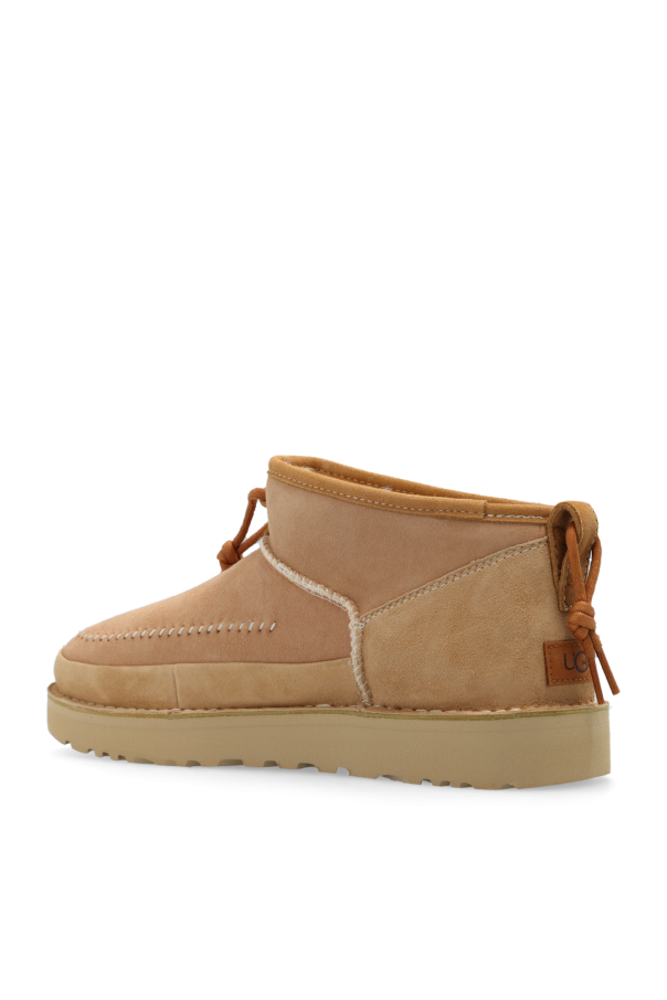 Beige ‘Ultra Mini Crafted Regenerate’ snow boots from UGG. Made of Premium Twinface sheepskin from farms that practice regenerative agriculture. Set on a beige rubber SugarSole™, this pair features a logo-embossed patch, decorative stitches, structured round toe and UGGplush™ sockliner from a blend of high-quality wool and soft lyocell as well as a pull strap for an easy on and off.