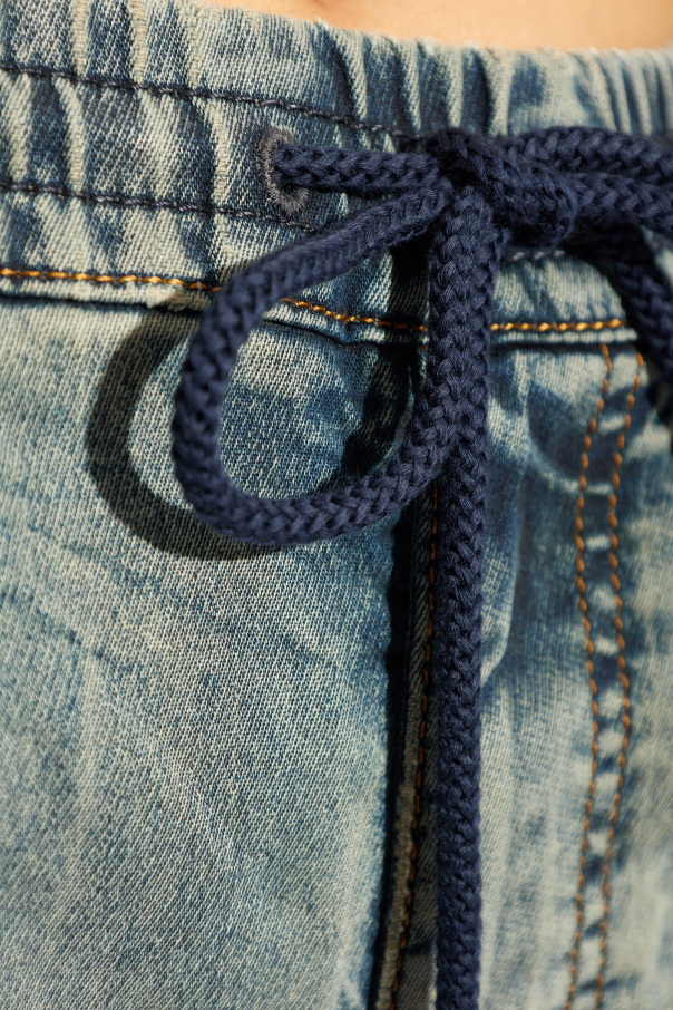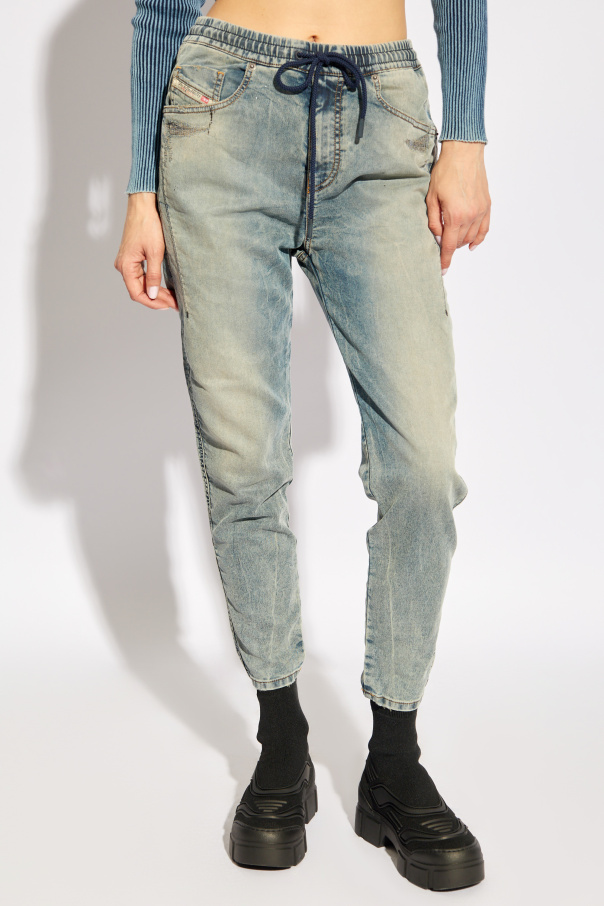 Introducing the Diesel '2041 D-FAYZA' Jeans, a quintessential blend of casual elegance and distinctive style. Crafted from a superior mix of 52% Lyocell, 45% Cotton, and 3% Elastane, these jeans exemplify comfort with a touch of stretch, ensuring a perfect fit. The dominant blue hue, delicately washed to achieve a vintage denim appearance, speaks volumes of its classic yet contemporary allure. The '2041 D-FAYZA' jeans are ingeniously designed with a flexible waistband and a thick, dark blue drawstring, adding a unique twist to the traditional skinny silhouette. This feature not only enhances comfort but also provides adjustable fit, making it a versatile addition to your wardrobe. The classic front and back pockets, accentuated with bold, golden stitching and potentially designer-signed metal rivets and buttons, further elevate the aesthetic appeal of these jeans. Notably, the jeans boast a practical aspect with their five-pocket design, inclusive of slide-in options, and are secured with a zipper closure, ensuring both functionality and style. The nuanced shades of gray, navy, and beige interplay to create a sophisticated, slightly worn look, making the '2041 D-FAYZA' a testament to Diesel's commitment to quality and fashion-forward thinking. Why Purchase This Product? Exclusive Design: The unique drawstring waistband and vintage finish set these jeans apart. High-Quality Material: A blend of Lyocell, Cotton, and Elastane offers durability and comfort. Versatile Wear: Suitable for various occasions, from casual outings to more sophisticated events. Attention to Detail: Golden stitching and premium metal components underscore the jeans' premium quality.