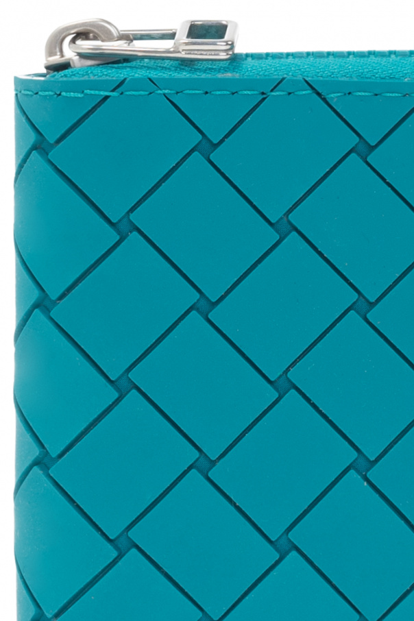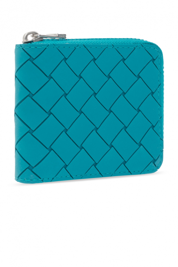 Bluish green rubber wallet from Bottega Veneta. Fastened with a zip, this model features the iconic Intrecciato weave as well as a coin pocket, three card slots, one slip pocket and bill compartment inside.