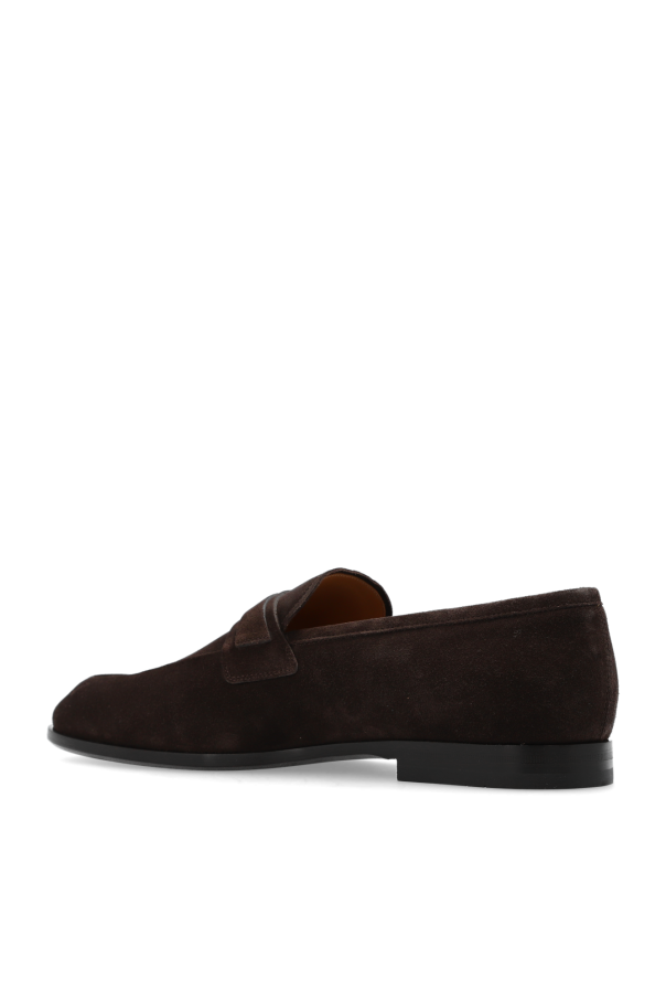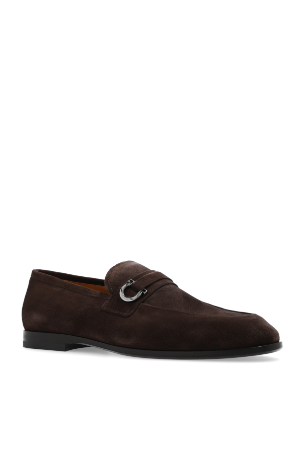 Dark brown ‘Florio’ loafers from FERRAGAMO. Made of calf suede, this model sits on a black rubber sole and showcases silver-tone Gancini hardware with an engraved logo on the front. Extrawide insole.