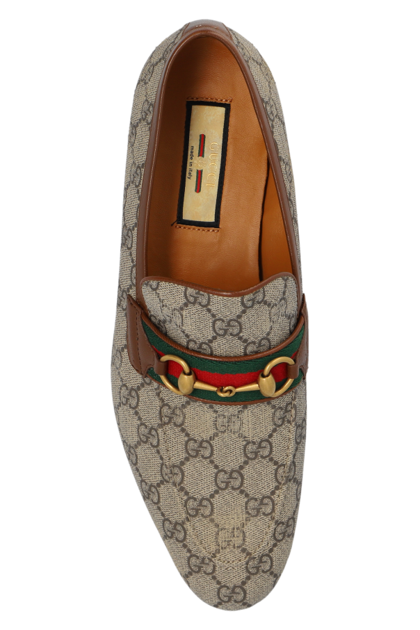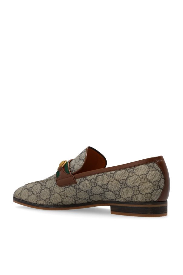 Beige and brown loafers from Gucci. Made from GG Supreme canvas and calf leather, this model sits on a beige rubber sole and showcases green-red-green Web stripe detailing and antiqued gold-tone horsebit hardware.