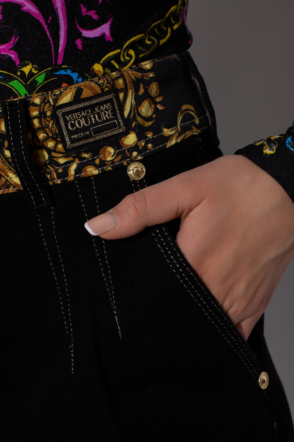 Black mom jeans from Versace Jeans Couture. Fastened with a zip and buttons, this pair features the label’s signature Baroque print, gold-tone lurex threads and four slip pockets.