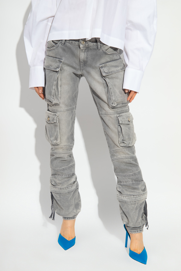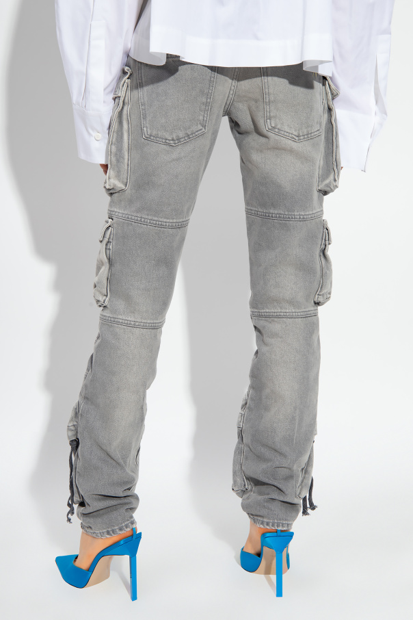 Grey ‘Effie’ skinny jeans from The Attico. Cut with a low-rise waist, this pair features a zip fly with a button, light green logo embroidery at the back multiple slip pockets, zip pockets and flapped pockets with snaps and buttons.