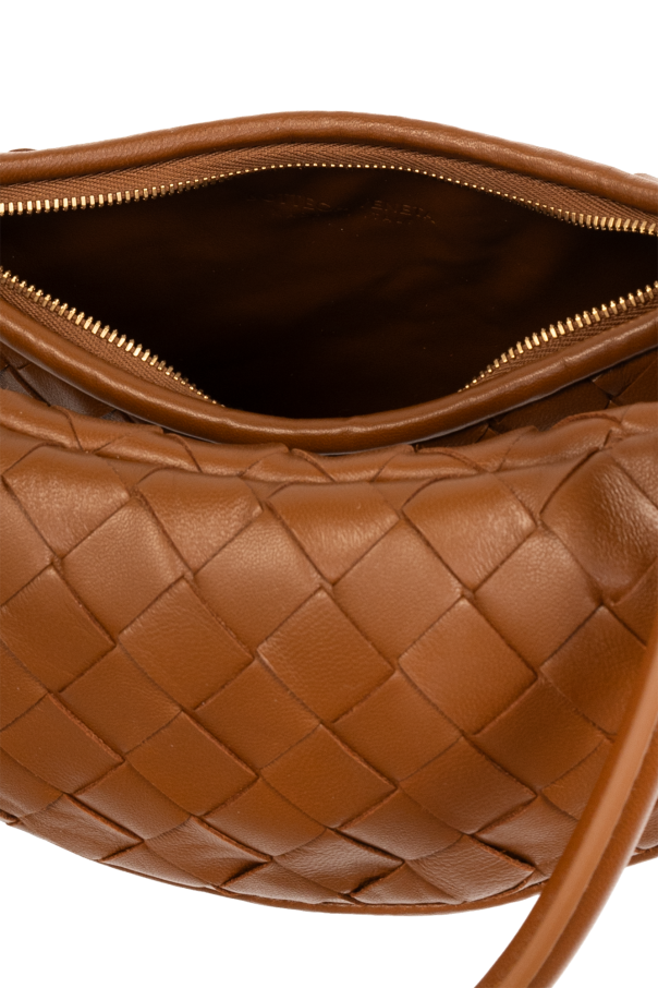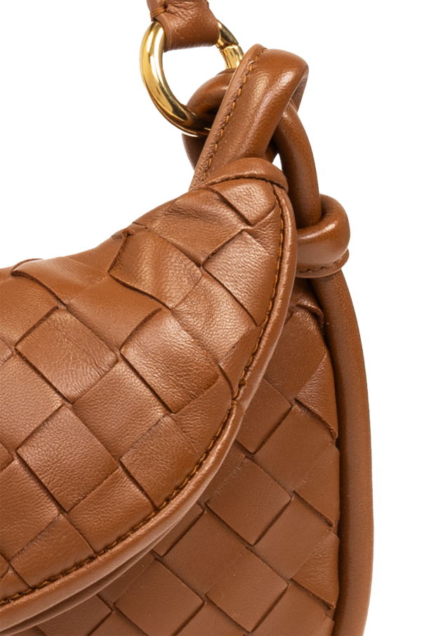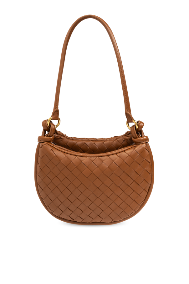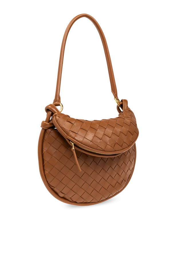 Brown ‘Gemelli Small’ shoulder bag from Bottega Veneta. Made of lamb leather with the iconic Intrecciato weave, this model features a zip fastening, two half-round handles - one with knots, the other zipped in the shape of a crescent, one internal compartment and gold-tone metal hardware.