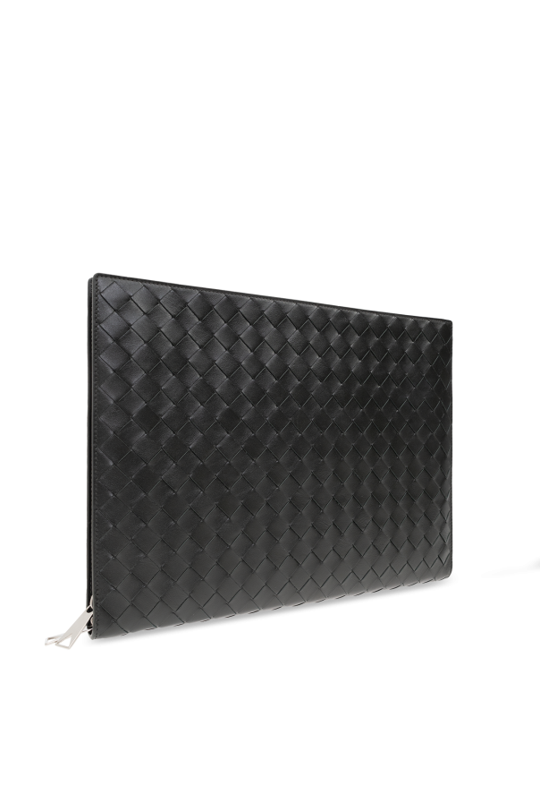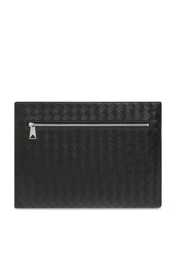 Dark green document case from Bottega Veneta. Crafted from leather with the brand’s signature Intrecciato weave, this item features a two-way zip, zipped back pocket, silver-tone metal hardware and one internal compartment with four slip pockets.