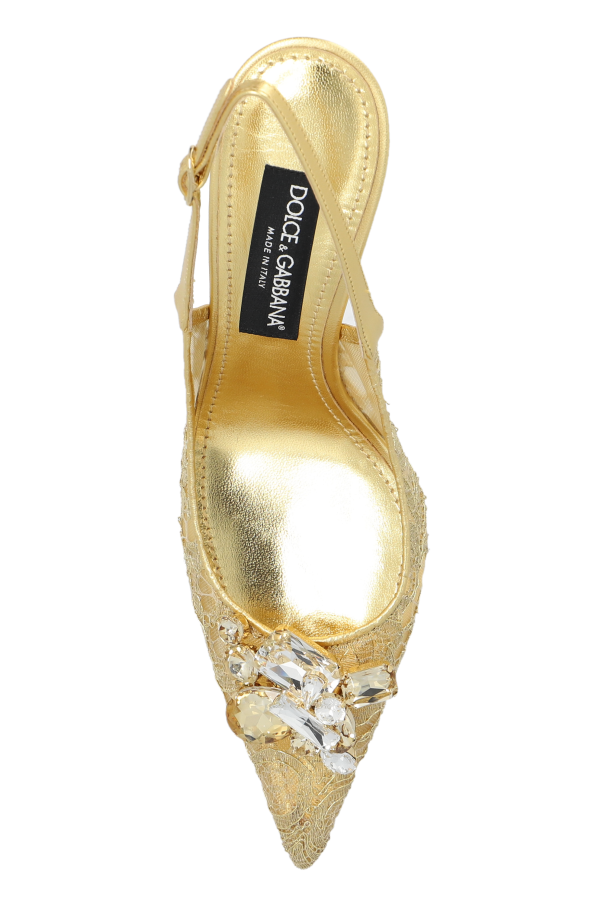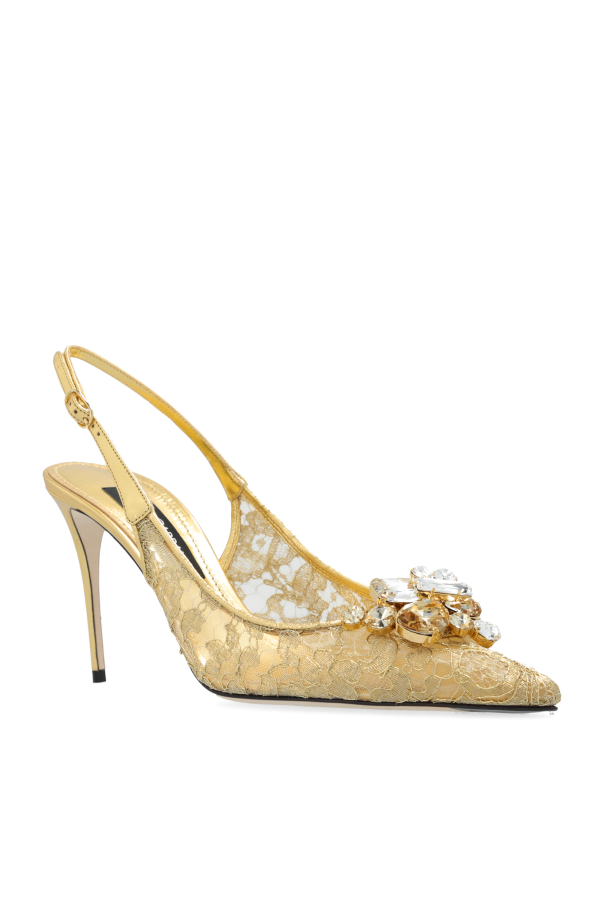 Introducing the "Lollo" High Heels from the exclusive collection by Dolce & Gabbana, a symbol of opulent charm and refined elegance. These two-part heels are a testament to the craftsmanship and luxurious design ethos of the iconic fashion house. The dominant gold color of these shoes exudes richness, enhanced by a material that sparkles with a glittering finish, suggesting the use of brocade or a similar shimmering fabric. A delicate floral pattern adorns the surface, adding a touch of femininity and grace. The pièce de résistance is the large, decorative floral appliqué at the toe, encrusted with shining stones, elevating the shoes to a realm of exclusivity. The silhouette of the shoe, defined by its pointed toe and slender stiletto heel, conjures an image of sleek sophistication, while the gold inner sole, crafted from soft leather, ensures comfort without compromising on style. The discreet gold logo of the designer on the heel strap is a subtle nod to the luxury and heritage of the Dolce & Gabbana brand. The ankle strap, offering both stability and support, is a practical feature that complements the timeless design of this exquisite footwear. Why Purchase the "Lollo" High Heels? Exemplify elegance with the luxurious gold color and sparkling material. Embrace femininity with the delicate floral pattern and ornate appliqués. Enjoy comfort and stability with the soft leather insole and supportive ankle strap. Experience the prestige of owning a piece from Dolce & Gabbana, renowned for their exclusive designs and high-quality materials.