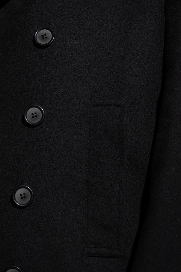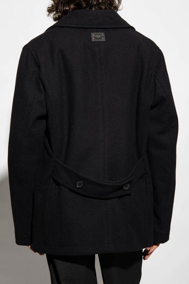 Black coat from Dolce & Gabbana. Crafted from wool with a cropped, double-breasted silhouette, this style features a decorative strap and logo-engraved plaque at the back, button closures, two frontal pockets and long sleeves.