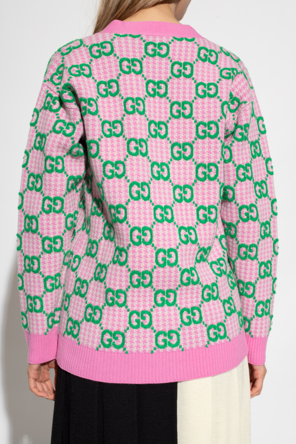 Pink and green cardigan from Gucci. Made of wool, this garment features button fastenings, embroidered monogram pattern, two front pockets and ribbed trims at the V-neck, hem and cuffs.