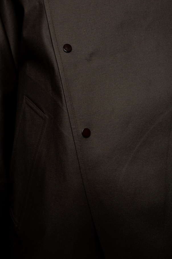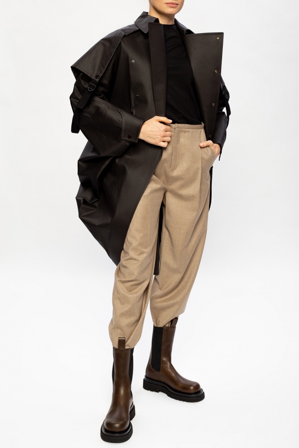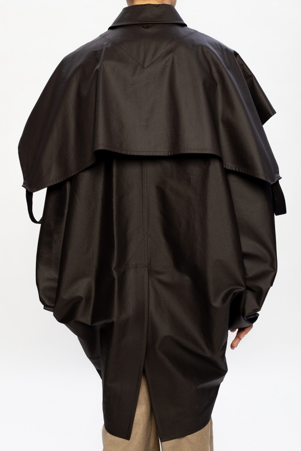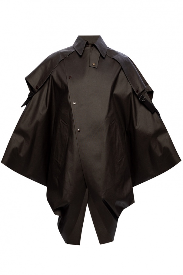 Black coat from Bottega Veneta. Crafted from coated stretch cotton in an oversize silhouette, this piece of outerwear fastens via snap-buttons and employs two welt pockets on the front and a detachable cape on the back.
