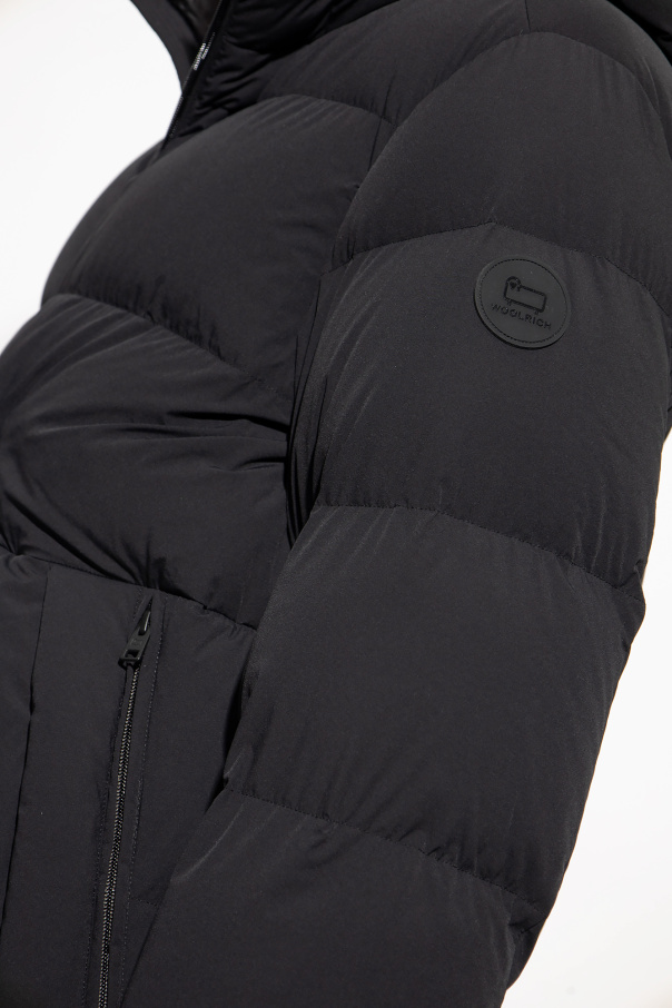 Black ‘Sierra Supreme’ long jacket from Woolrich. Made in stretch nylon with waterproof and windproof properties, this style fastens with a two-way zip and features a rubber logo patch, two zip pockets and two snap-fastened pockets on the front, down padding, long sleeves, black lining and a drawcord-adjustable hood and hem.