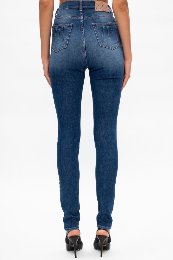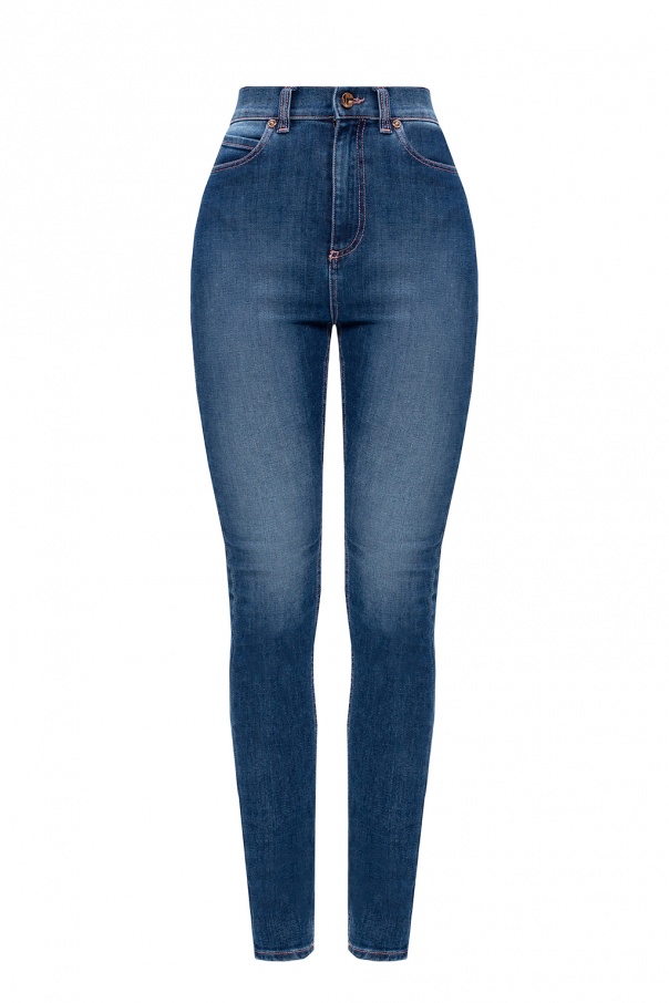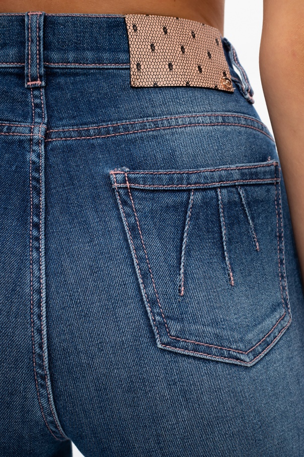 Blue jeans from Red Valentino. This straight leg design features a pink and black patch, pink stitching details and five slip pockets.