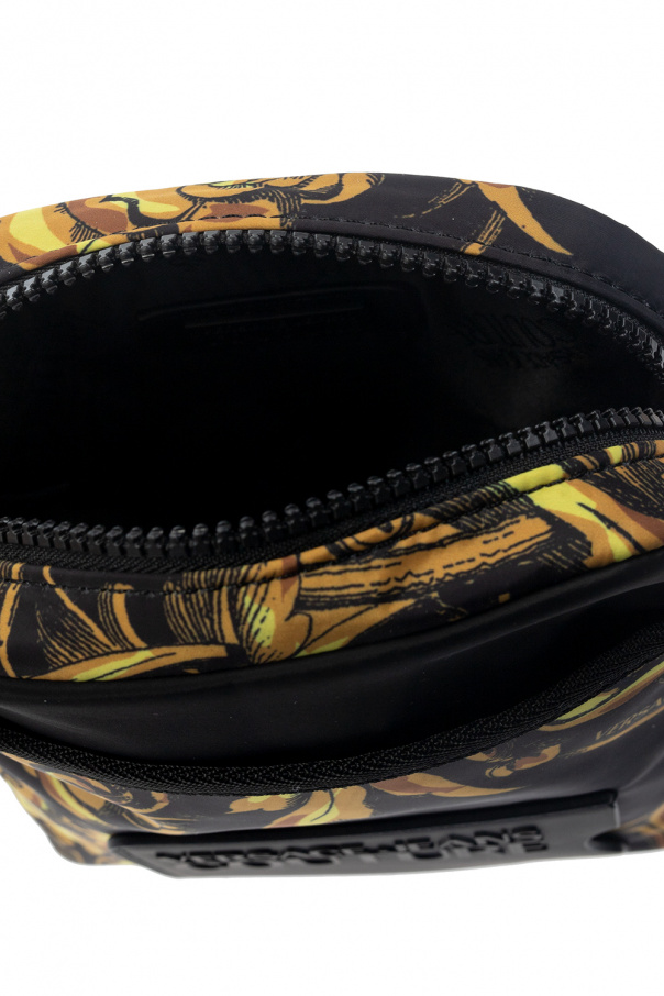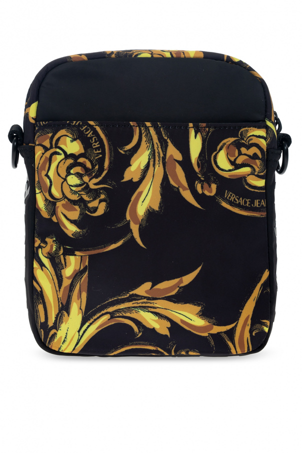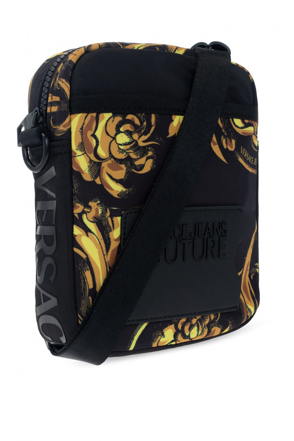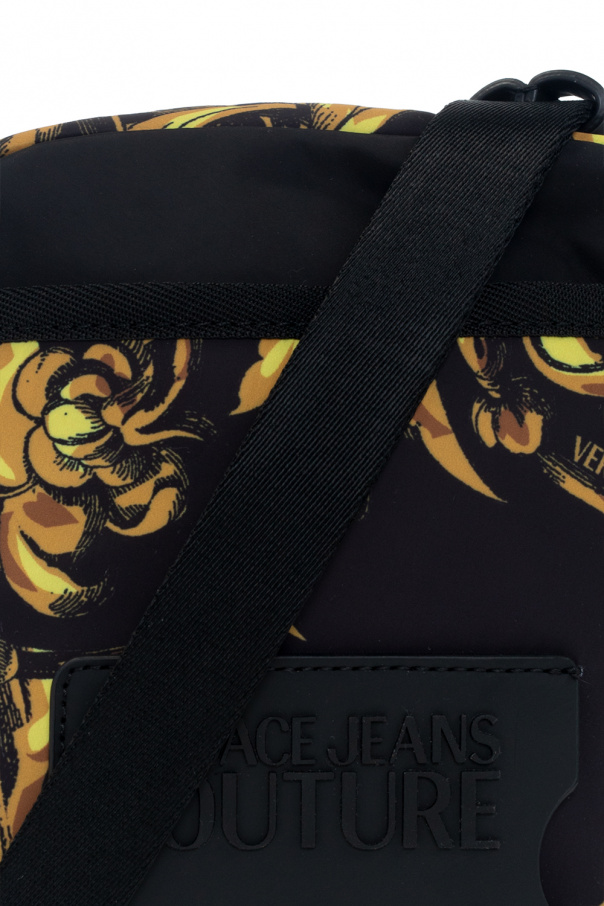 Black shoulder bag from Versace Jeans Couture. Fastened with a zip, this design features a Baroque motif in light brown and yellow, card slot with a raised logo, one slip pocket, detachable and adjustable shoulder strap, back slip pocket and one internal compartment.