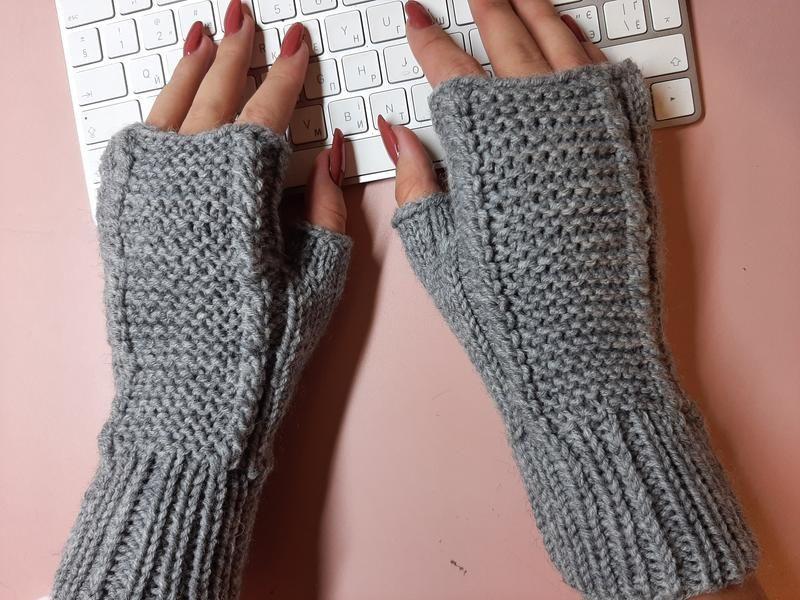 Митенки- перчатки без пальцев, с анатомическим пальцем, вязаные спицами, 100% ручная работа