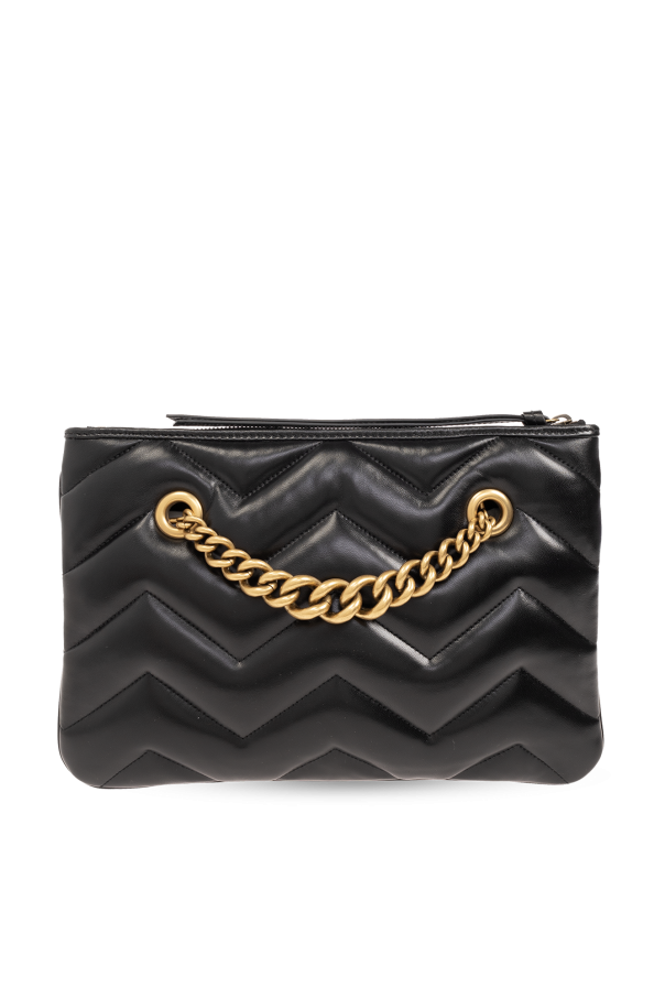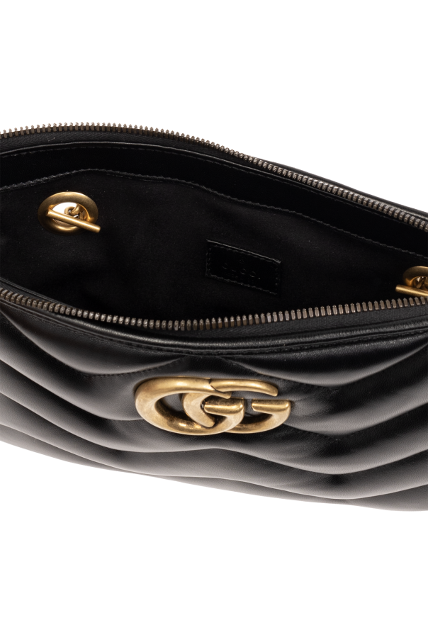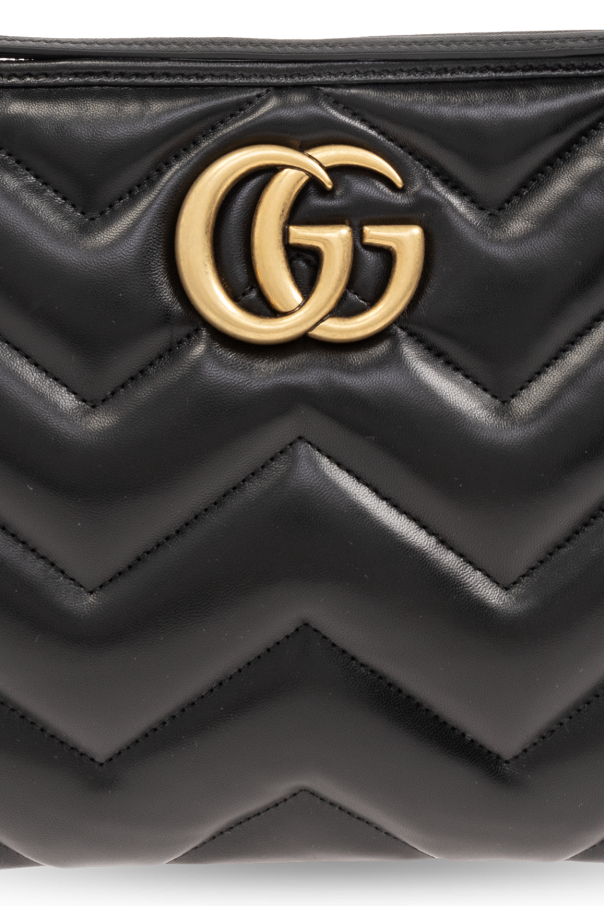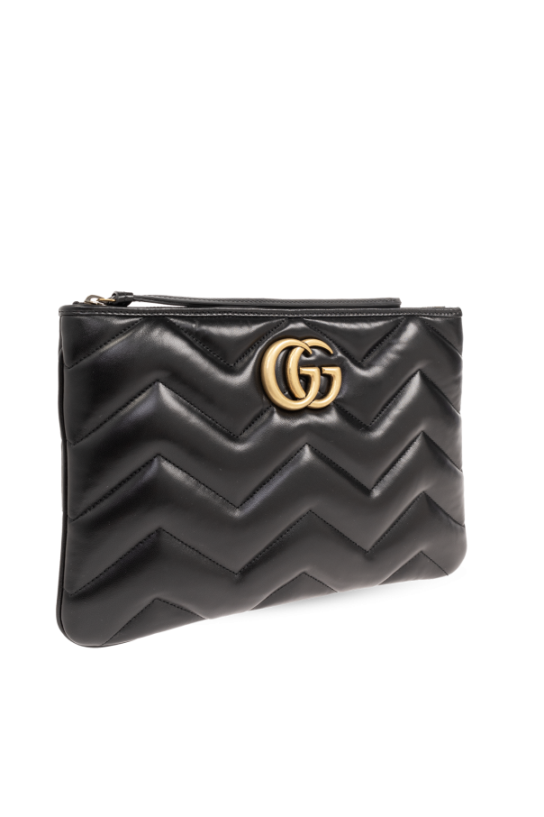 Black quilted clutch from Gucci. Made from lamb leather, this design fastens via a zip and showcases Double G hardware on the front, a short and detachable chain strap on the back, antiqued gold-tone metal elements and one internal compartment.