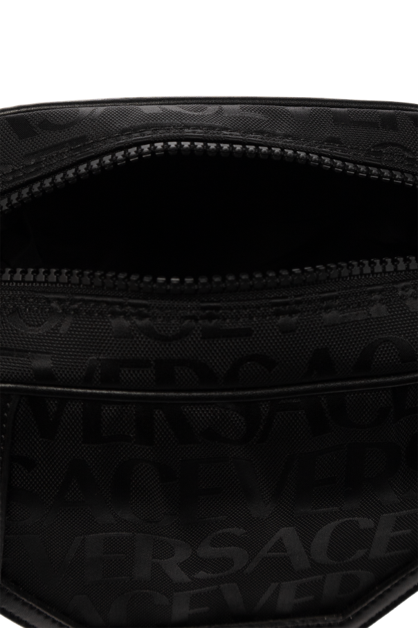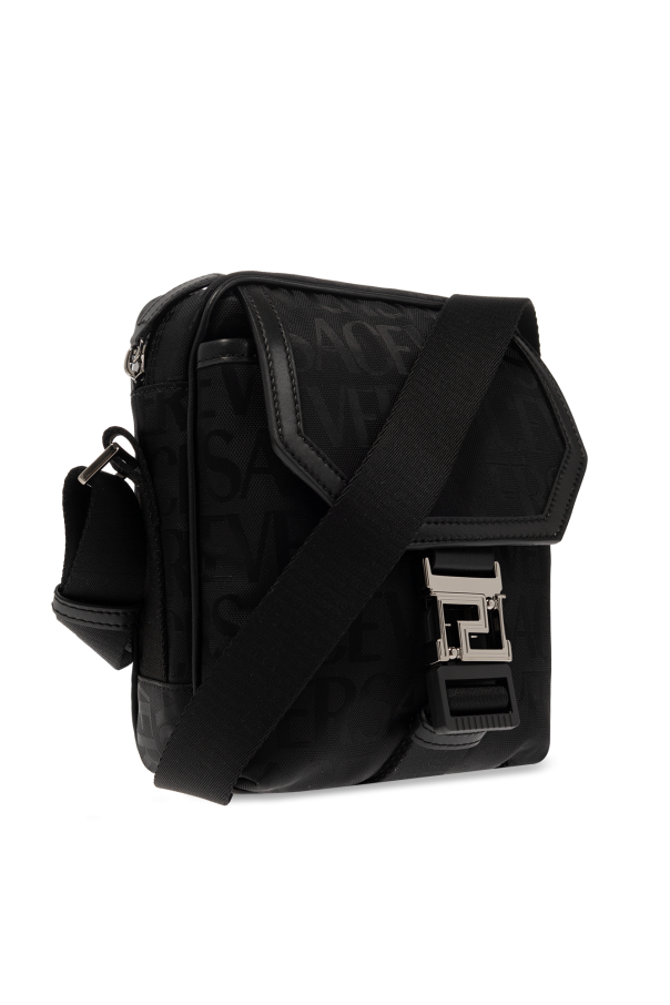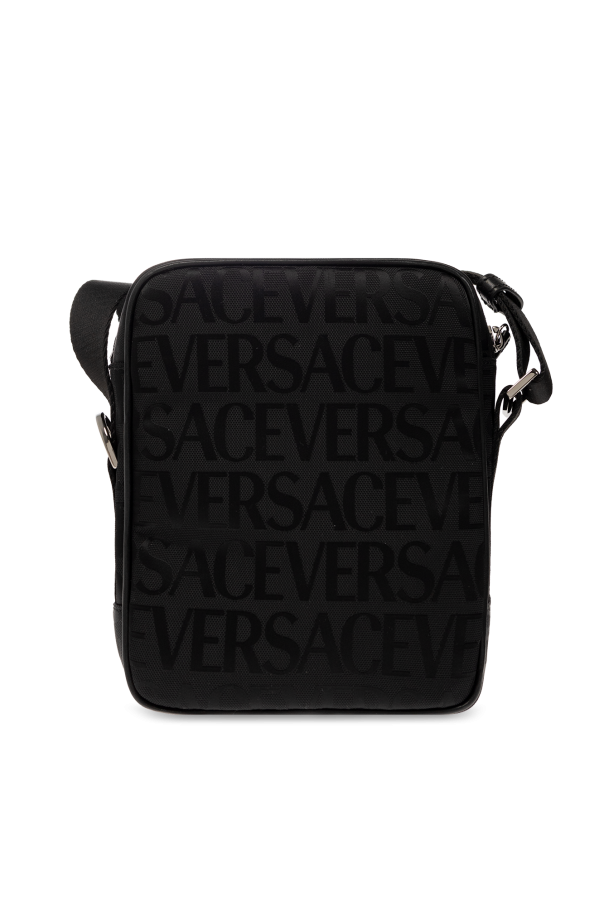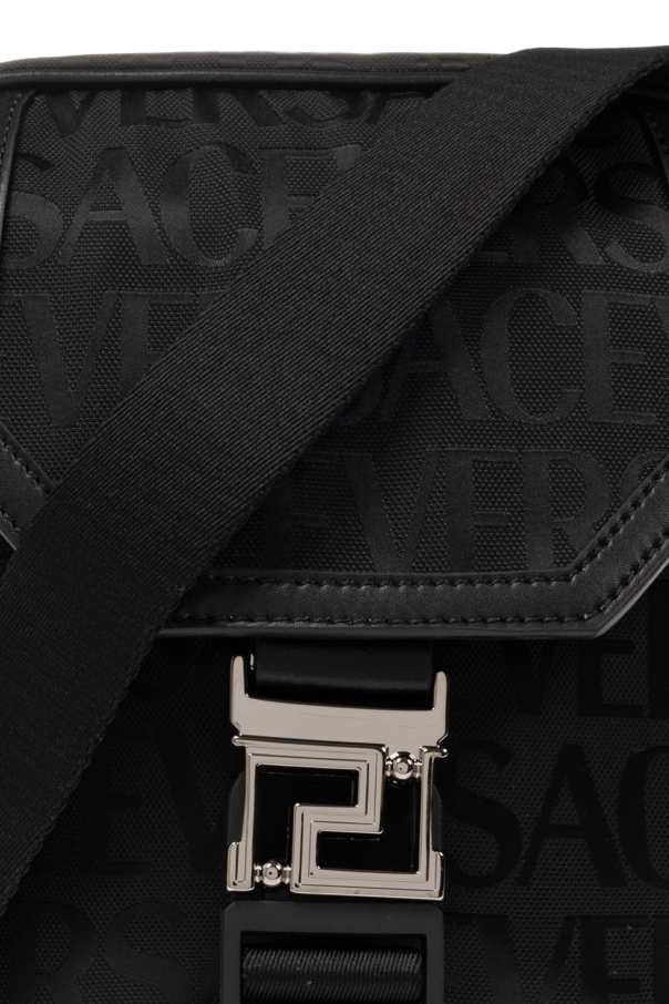 Black shoulder bag from Versace. Made of fabric embroidered with a logo pattern, this design features a zip fastening, front pocket with a strap and Greca buckle, adjustable shoulder strap, one internal compartment and silver-tone metal hardware.