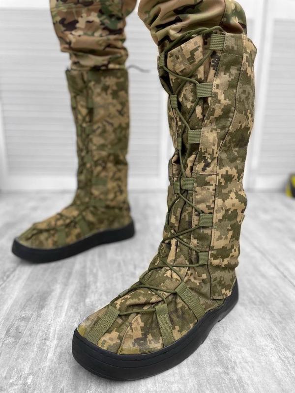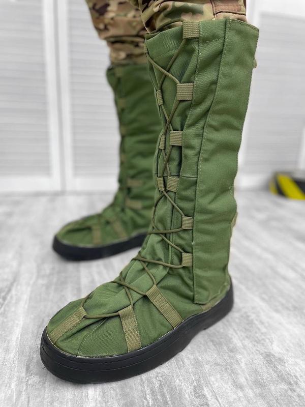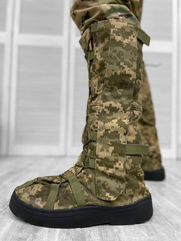 XL(46-48)Бахилы утеплены на мокрую и грязную погоду из синтетического полотна – 100% полиамид с синтетическим утеплителем. Надеваются прямо на ботинки или берцы предохраняя их от возможного промокания или загрязнения. Также бахилы дополнительно сохраняют тепло, не давая головной обуви промерзать и мокнуть. Бахилы будут необходимы для военных! Подошва резиновая. Сбоку застежка-молния и защитная планка на липучке.