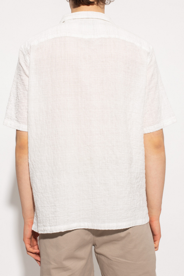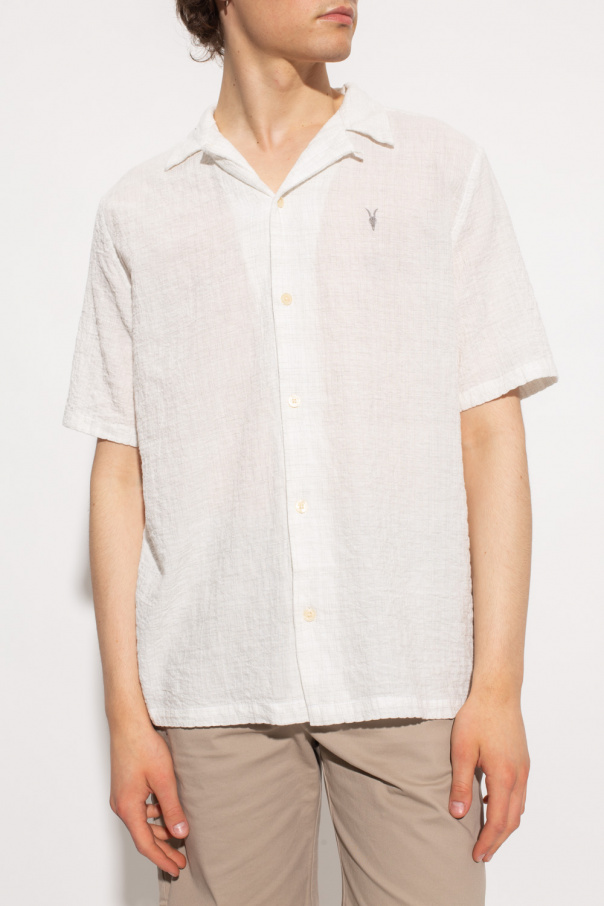 White ‘Mattole’ shirt from AllSaints. Made of cotton, this style showcases a light grey check pattern, button fastenings, side slits, short sleeves and an embroidered Ramskull logo the front.