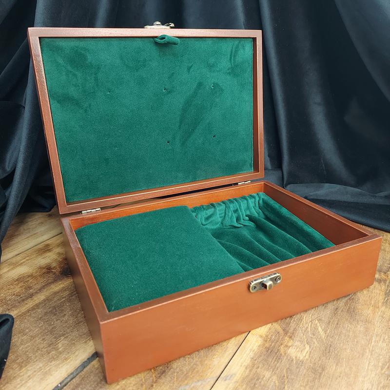 Шкатулка имеет отдел для удостоверения типа книжечки и отдел для медалей, присутствует вкладка с отверстиями для значков на внутренней стороне крышки. Обшита зеленым бархатом. Имеет гравировку в виде герба.