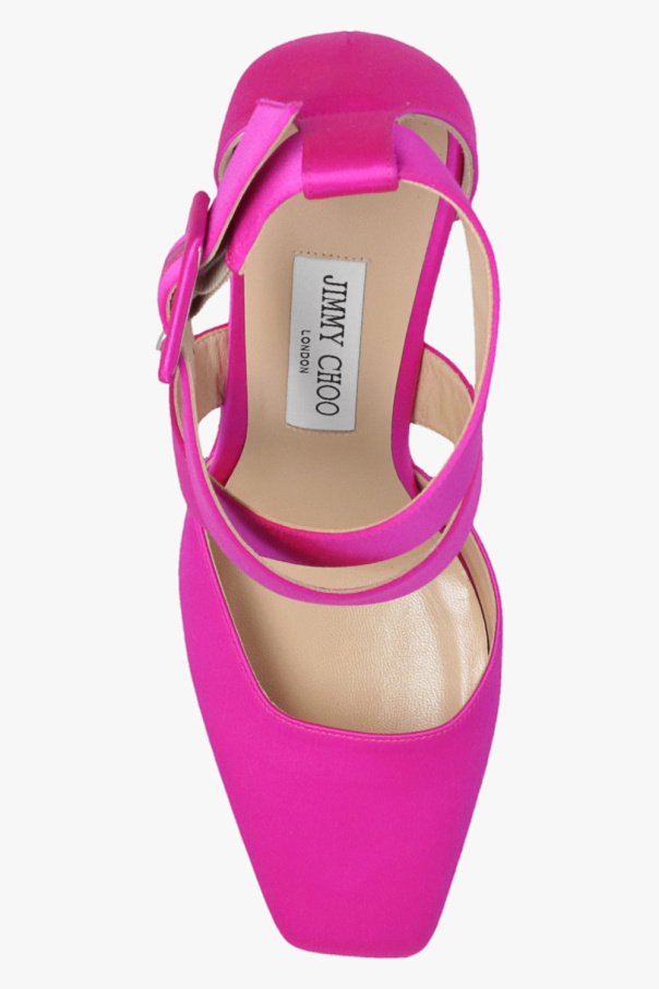Pink ‘Gian’ platform pumps from Jimmy Choo. Crafted from satin, this pair features an adjustable buckle ankle straps, a square toe and cream leather sole.