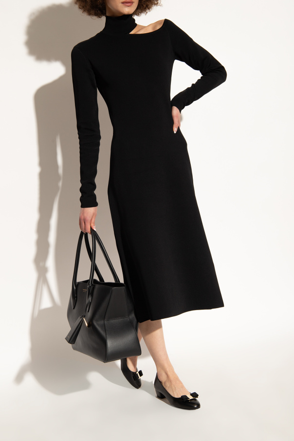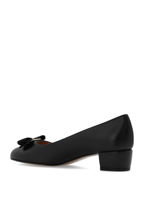 Black ‘Vara’ pumps from FERRAGAMO. Made of smooth calf leather, this model sits on a light beige leather sole and features a round toe, a standard footbed and a grosgrain bow accompanied by a gold-tone plaque with an engraved logo on the front.