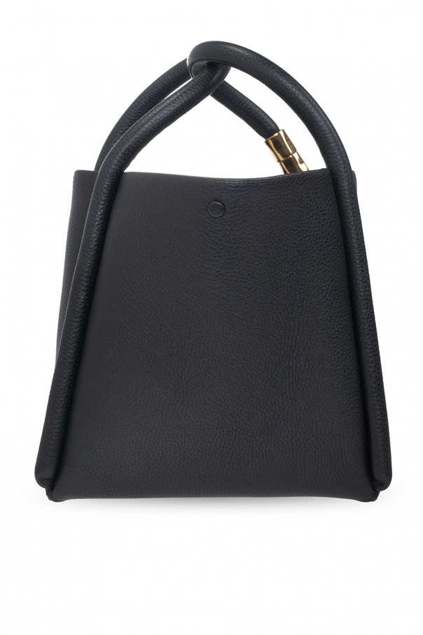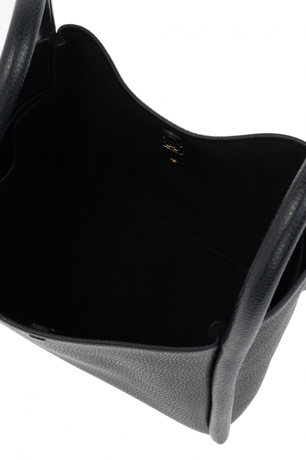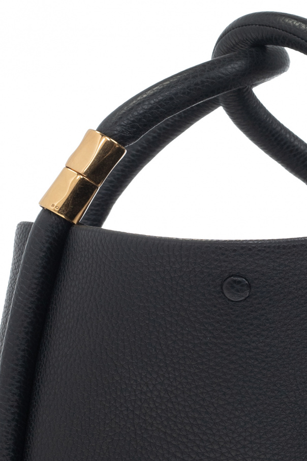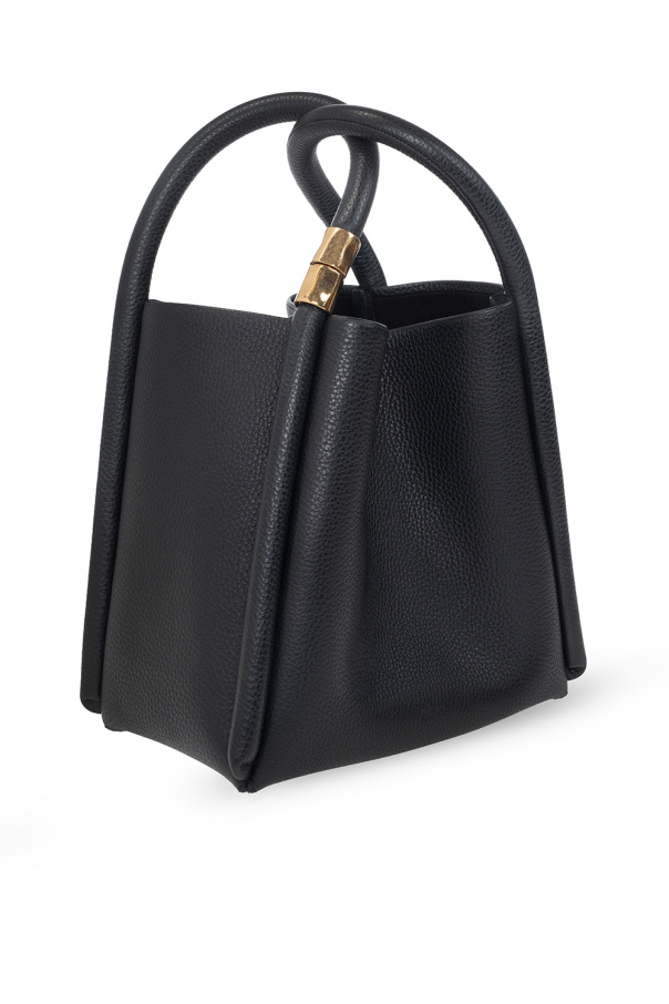 Black ‘Lotus 20’ handbag from Boyy. Made of calf leather, this design features a buckle closure, gold-tone metal details, two half-round handles, a detachable and adjustable shoulder strap, antiqued gold-tone metal hardware and a black suede-clad interior with one compartment and four card slots.
