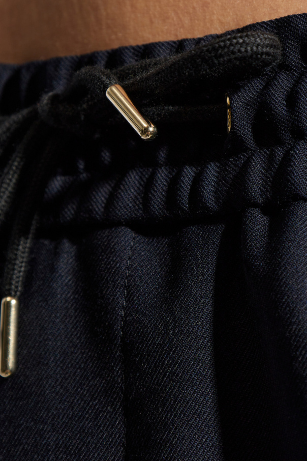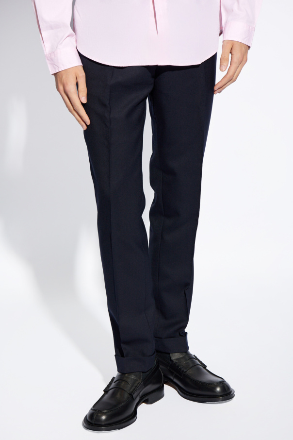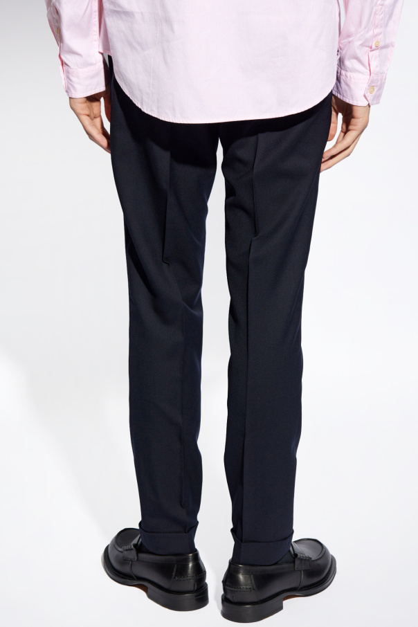 Navy blue pleat-front trousers from Paul Smith. Made of wool, this pair falls down with tapered legs with upturned cuffs and features a drawstring waist, two side seam pockets and two back button pockets.