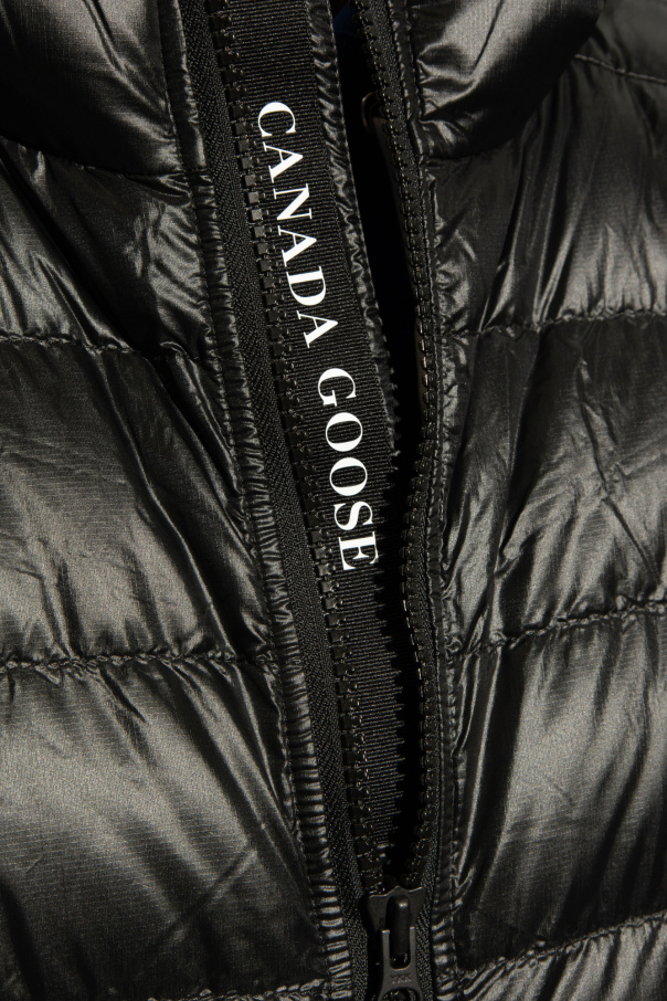 Black ‘Crofton’ quilted down jacket with a drawcord-adjustable hood from Canada Goose. Emblazoned with a red, white and navy blue branded patch on the sleeve, this winter-savvy design is complete with a two-way zip fastening and two zipped pockets on the front. Temperature rating: 0°C / -15°C.