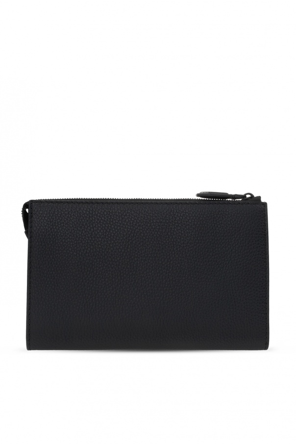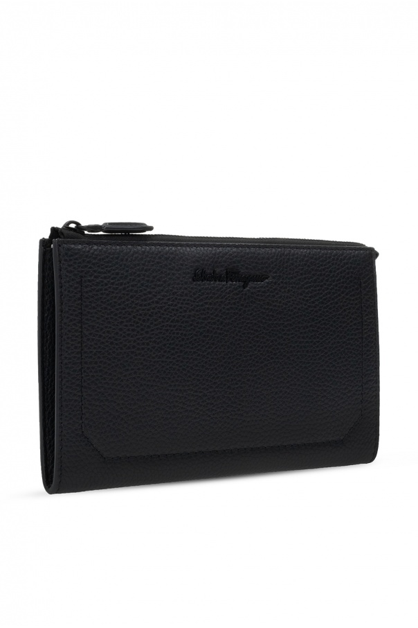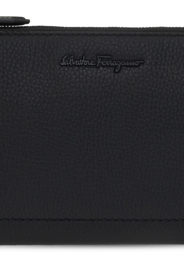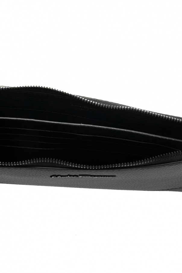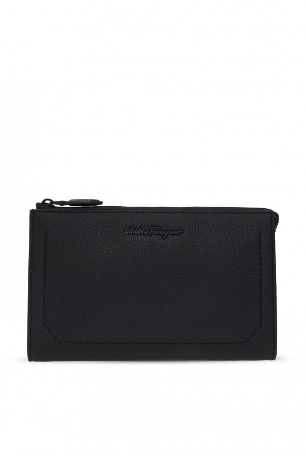 Black clutch from Salvatore Ferragamo. Crafted from leather with a texture throughout, this accessory fastens via zip closure and employs logo plaque on the front and interior with two compartments, three slide pockets and six card slots.
