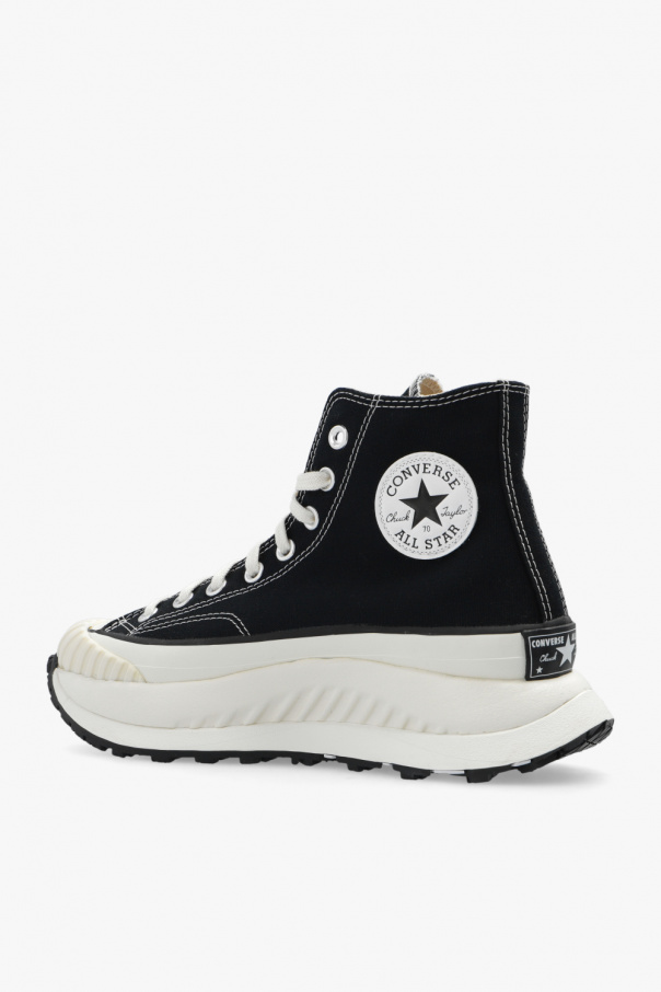 Black and cream ‘Chuck 70 AT-CX’ high-top sneakers from Converse. Crafted from canvas with at least 50% recycled content, this lace-up model showcases a white and black logo on the side and back, TPU BOSEY toe guard that ensures durability, CX foam midsole, insole for increased comfort as well as a white and black chunky rubber outsole.