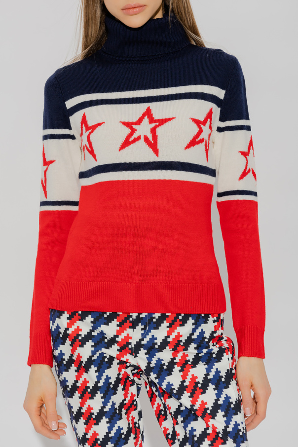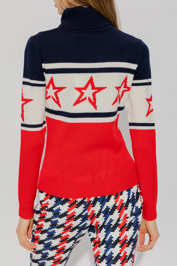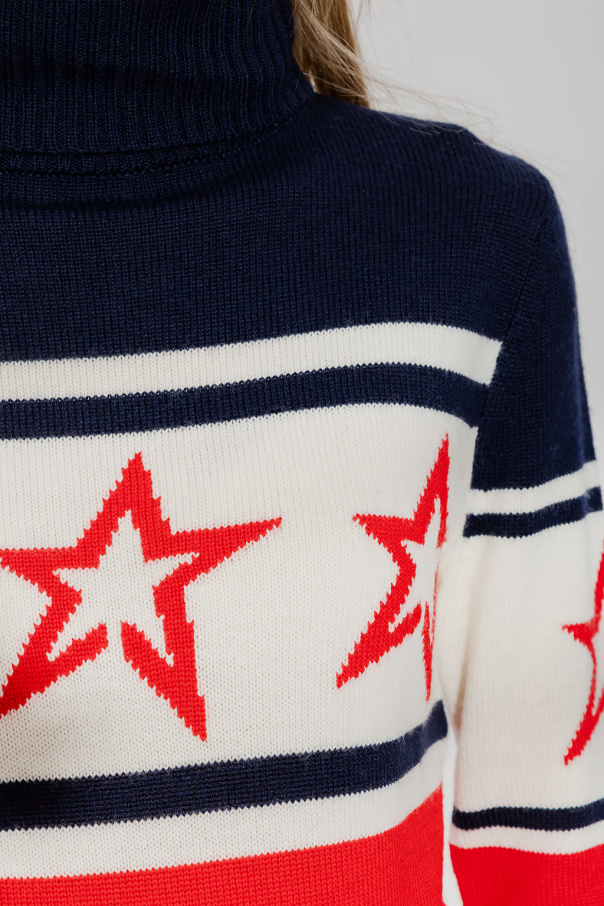 Navy blue, red and beige ‘Chopper’ turtleneck sweater from Perfect Moment. Made of merino wool, this style showcases red graphic embroidery with a logo and stripes, a snug collar, long sleeves and a ribbed bottom hem and cuffs.