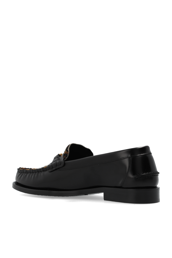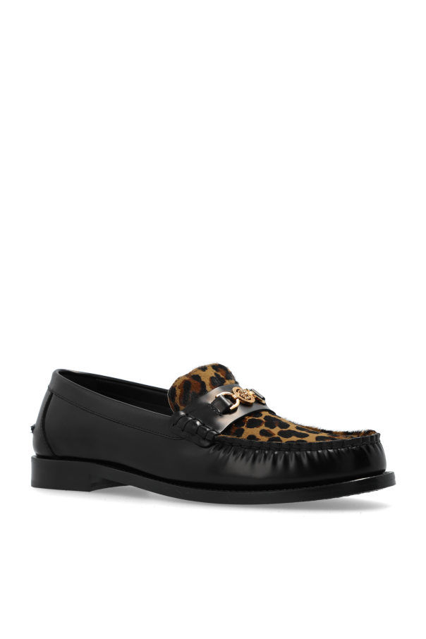 Introducing the quintessential Leather Loafers from Versace's exclusive collection. These shoes seamlessly blend classic elegance with a bold, contemporary twist, making them an essential addition to any sophisticated wardrobe. Crafted from the finest smooth black leather, these loafers feature a distinctive leopard print front, adding a touch of audacious charm. The design is further elevated by a luxurious gold metal fastener adorned with the iconic Medusa head logo, a hallmark of Versace. The interior, lined with black leather and accented by a white "VERSACE" imprint, ensures both comfort and style. The flat, rounded-toe silhouette embodies timeless sophistication, while the unique leopard print detail offers a modern edge. Why Purchase This Product? Exquisite Craftsmanship: Made from premium leather, ensuring durability and elegance. Iconic Design: Features Versace's signature Medusa head logo, symbolizing luxury and style. Unique Detail: Leopard print front adds a distinctive, fashionable touch. Comfort: Leather-lined interior for a comfortable fit. Versatile Style: Perfect for both formal and casual occasions.