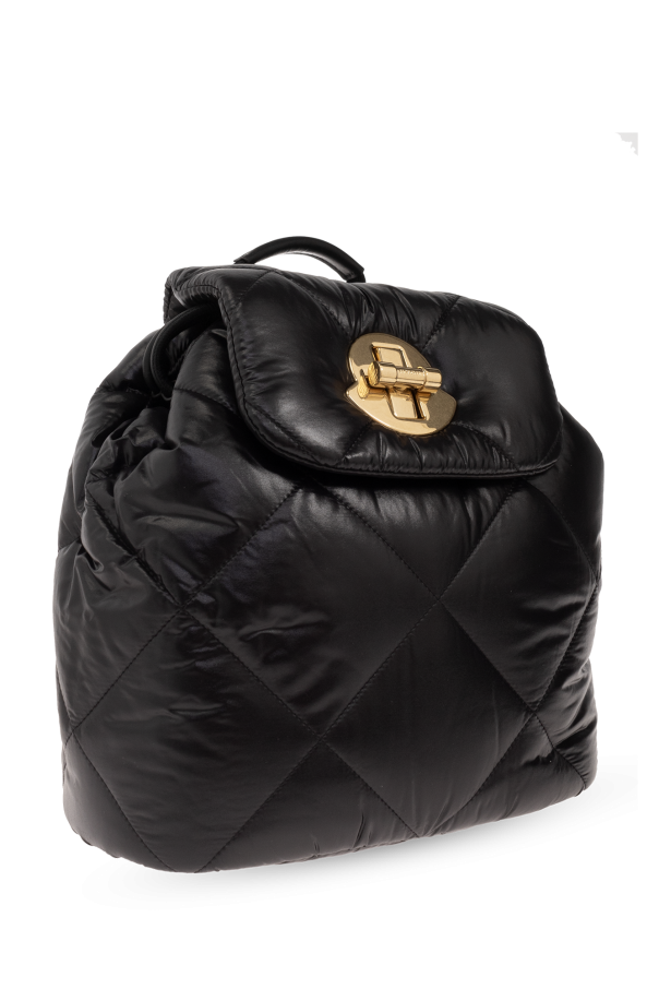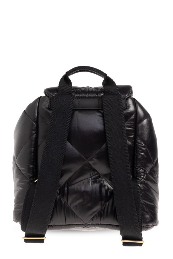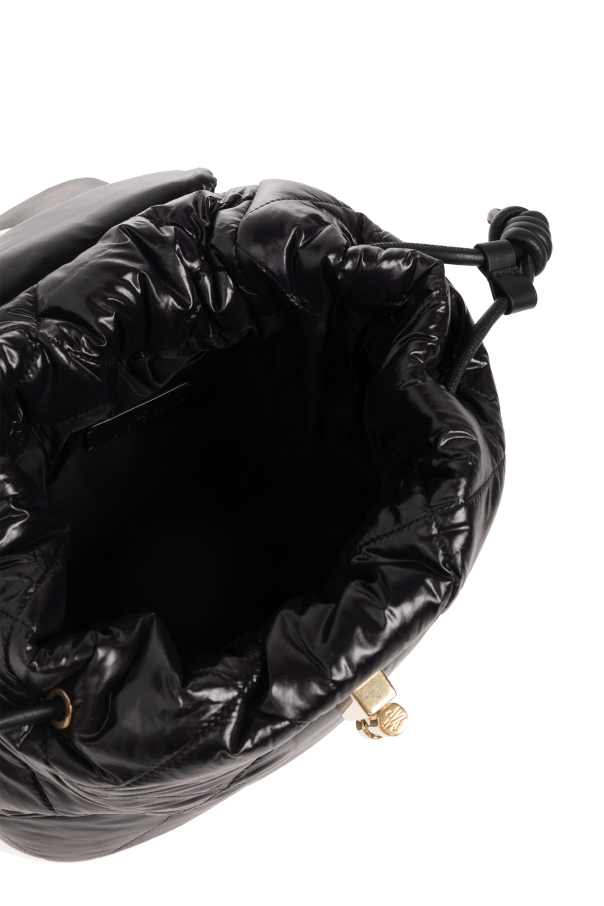 Black ‘Puf’ quilted backpack from Moncler. This design secures via a logo-shaped twist fastener and features a half-round handle, adjustable shoulder straps, antiqued gold-tone metal hardware and a drawstring-cinched interior with one compartment and one slip pocket.